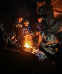 يسير فلسطينيون في أحد شوارع مدينة غزة، بينما يكافح النازحون في خيامهم لمواجهة الظلام، يتدفؤون ويطهون طعامهم بالحطب، محرومين حتى من أبسط مقومات الحياة، 19 يناير/كانون الثاني 2026. صورة: عمر أشتوي