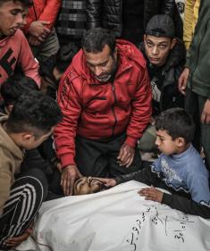 وداع جثمان الطفل إياد أحمد الربيعية (3 أعوام) في مستشفى ناصر بخان يونس، جنوب قطاع غزة، 2 فبراير/شباط 2026. صورة: طارق محمد