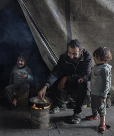 عائلات تعيش في خيام مؤقتة وسط الأنقاض تشعل نيرانًا للتدفئة في جباليا، شمال قطاع غزة، في 12 يناير/كانون الثاني 2026. ويكافح الفلسطينيون الذين دُمرت منازلهم في هجمات إسرائيلية من أجل البقاء في ظل ظروف شتوية قاسية وبرد قارس. صورة: عمر أشتوي