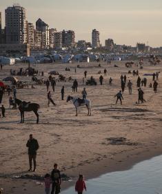 يقضي الفلسطينيون أوقاتهم على شاطئ البحر عند غروب الشمس في مدينة غزة. في الوقت نفسه، تحوّل شاطئ القطاع إلى مخيم مؤقت للنازحين الذين دُمّرت منازلهم خلال الحرب. 16 يناير/كانون الثاني 2026. تصوير: عمر أشتوي