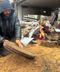 على مدى 160 يومًا، الفلسطيني اسماعيل ابو حماد (45 عامًا) يستخدم مجرفة وفأس ومنخل للعثور على رفات عائلته بعد أن فقد زوجته وأطفاله الـ6 في هجوم إسرائيلي استهدف منزله في حي الصبرة بمدينة غزة ، 19 يناير/كانون الثاني 2026. (صورة: مطر الزاق)