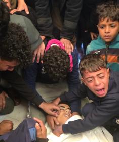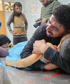 عائلة الطفل المعتصم بالله الشرافي تودع جثمانه في مجمع ناصر الطبي بخان يونس، جنوب قطاع غزة، 21 يناير/كانون الثاني 2026. (صورة: طارق محمد)