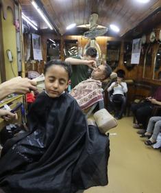 الفلسطينيون يقصون شعورهم داخل محل لتصفيف الشعر في مدينة خانيونس استعدادا لعيد الفطر