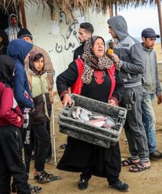 المسنة الفلسطينية أم جميل الأقرع من دير البلح وسط قطاع غزة تشتري الأسماك من الحسبة لتبيعها في السوق، لتعيل أسرتهامع احتفال العالم بيوم المرأة العالمي.