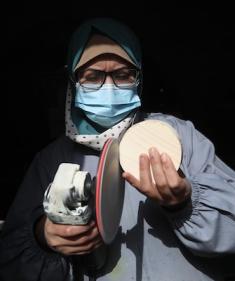 سيدات فلسطينيات يُبدعن بصنع الهدايا الخشبية في منجرة متواضعة تابعة لجمعية زين التعاونية في بيت لاهيا شمال قطاع غزة، لبيعها بيوم المرأة العالمي
