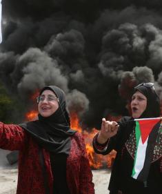 فلسطينيات يشاركن في مسيرة في اليوم العالمي للمرأة على مدخل قرية برقة غرب مدينة نابلس