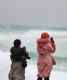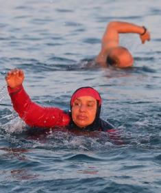 عشاق السباحة من كبار السن يمارسون هوايتهم على شاطئ بيت لاهيا في مربعانية الشتاء