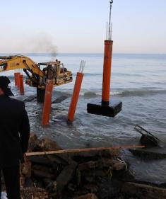 عمال فلسطينيون يديرون جرافة لنصب ركائز في البحر الأبيض المتوسط لبناء مقهى "القلعة" وهو أول مقهى خرساني عائم على شاطئ مدينة غزة باستخدام مواد بسيطة.