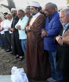 فلسطينيون يؤدون الصلاة على بقايا الرفات من القبور التي هدمتها قوات الاحتلال الإسرائيلي في المقبرة اليوسفية في القدس، قبل إعادة دفنها مرة أخرى