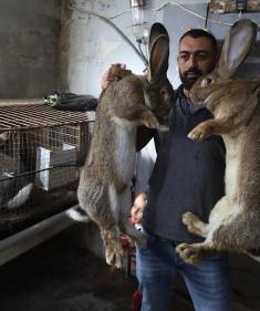 الخليل - المواطن صالح الشعراوي من قرية امريش جنوب دورا قرب الخليل، يؤسس مزرعة لتربية الارانب من السلالات النادرة، خاصة السلالة الالمانية باهظة الثمن: تصوير - مشهور وحواح