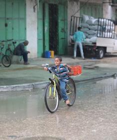 فلسطينيون يسيرون في الشارع خلال يوم ماطر في مدينة دير البلح وسط قطاع غزة