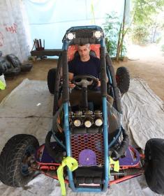 الفلسطيني فتحي أبو غرابة ، 46 سنة ، يخترع سيارة سباق في مخيم المغازي للاجئين وسط قطاع غزة ، باستخدام مواد خردة ومعدات بدائية بتكلفة 3500 دولار أمريكي. تصوير: أشرف عمرة