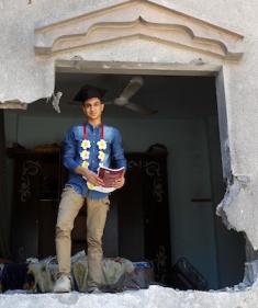 الطالب يحيى السقا الحاصل على معدل 94.9% في "التوجيهي" يحتفل بنجاحه على أنقاض غرفته المدمرة بالقصف الإسرائيلي الأخير في خان يونس جنوب قطاع غزة