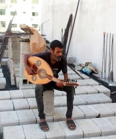 اللاجئ الفلسطيني كمال أبو غبن ، 57 عامًا ، يعزف على آلة العود الموسيقية، أثناء راحته في العمل، في مدينة غزة
