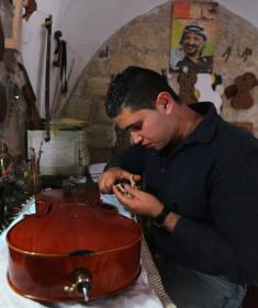 شحادة شلالدة ، اول صانع كمان في فلسطين ./ تصوير: محمد فراج- وفا
