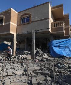آثار العدوان الإسرائيلي الذي طال منزل الشهيد جهاد غنام أمين سر المجلس العسكري لسرايا القدس بمدينة رفح جنوب قطاع غزة .. تصوير (الفرنسية)