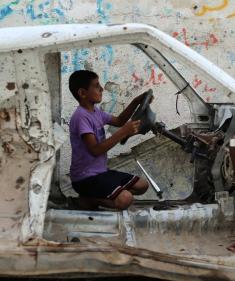 اطفال من غزة يلعبون في هيكل مركبة تعرضت للقصف الاسرائيلي في حرب 2014 عشية الاحتفال بعيد الاضحى
