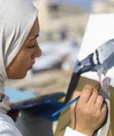 الطفلة النازحة سارة سعدة (14 عامًا) تمارس شغفها الفني بالرسم في خيمتها بمدينة غزة،23 ديسمبر/كانون الأول 2025 تصوير: عمر أشتوي
