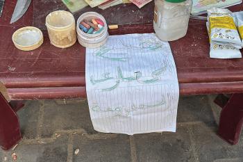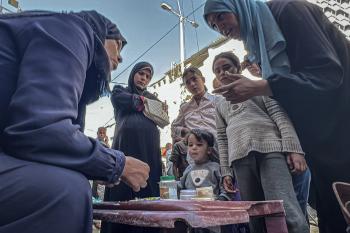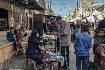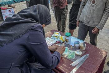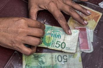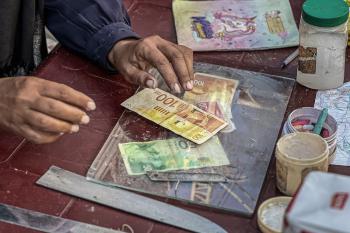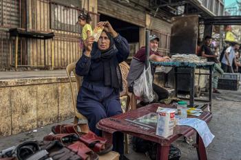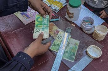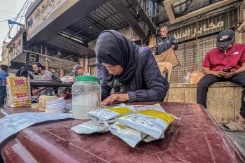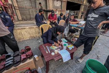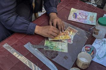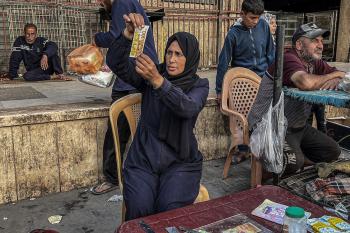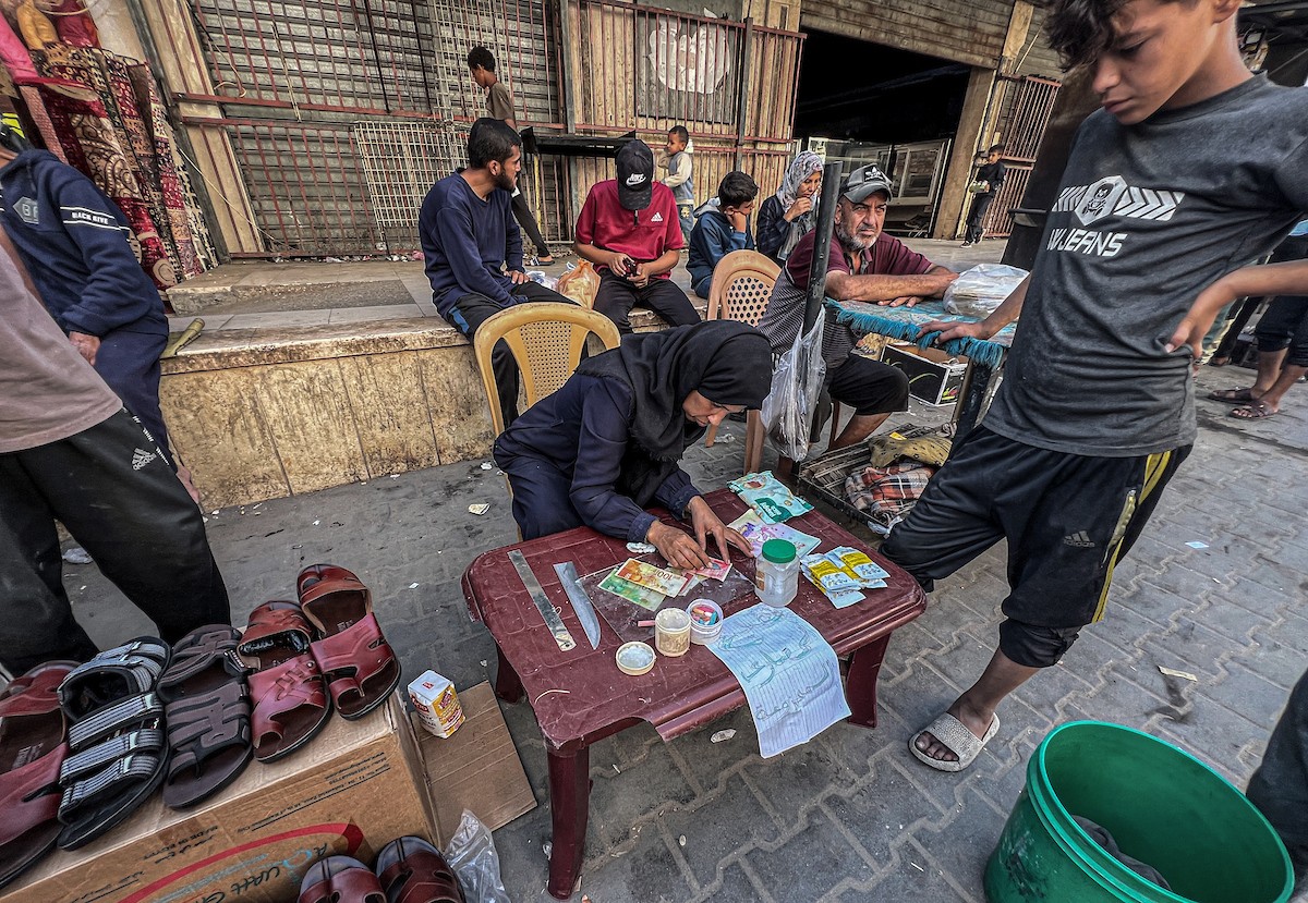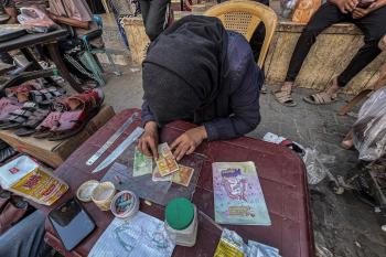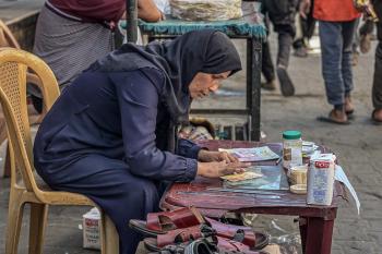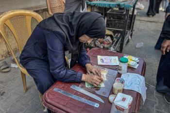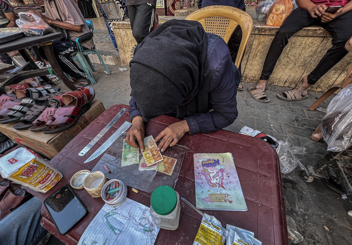 الفلسطينية منال السعيداني تُصلح أوراقًا نقدية قديمة ومهترئة في مخيم النصيرات، وسط قطاع غزة، تصوير: بلال أبو عامر