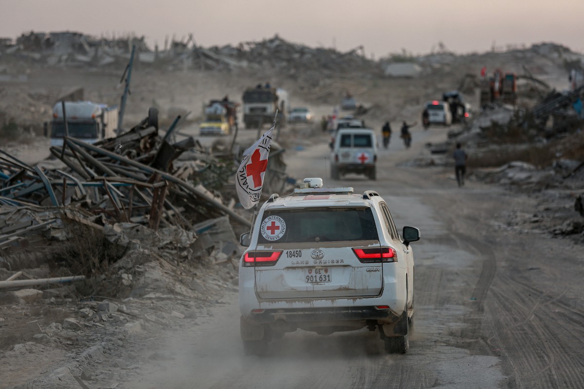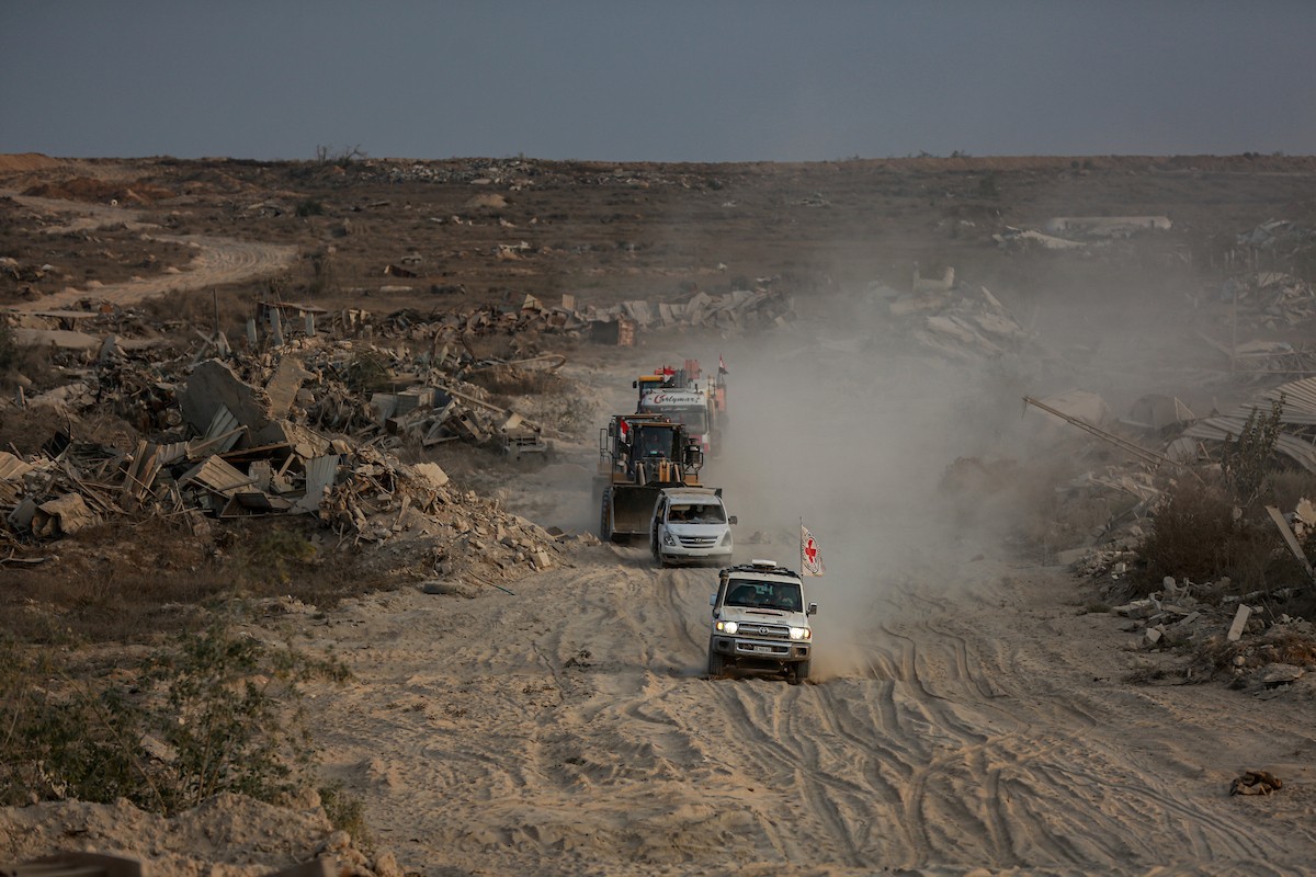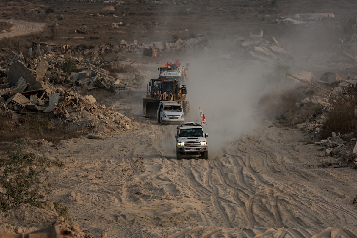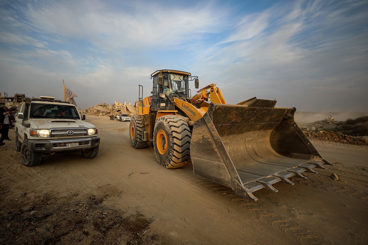 عمليات البحث لاستعادة جثث الرهائن الإسرائيليين، يجريها أعضاء من كتائب القسام، ومسؤولون من اللجنة الدولية للصليب الأحمر في حي الزيتون بقطاع غزة. تصوير: عمر أشتوي