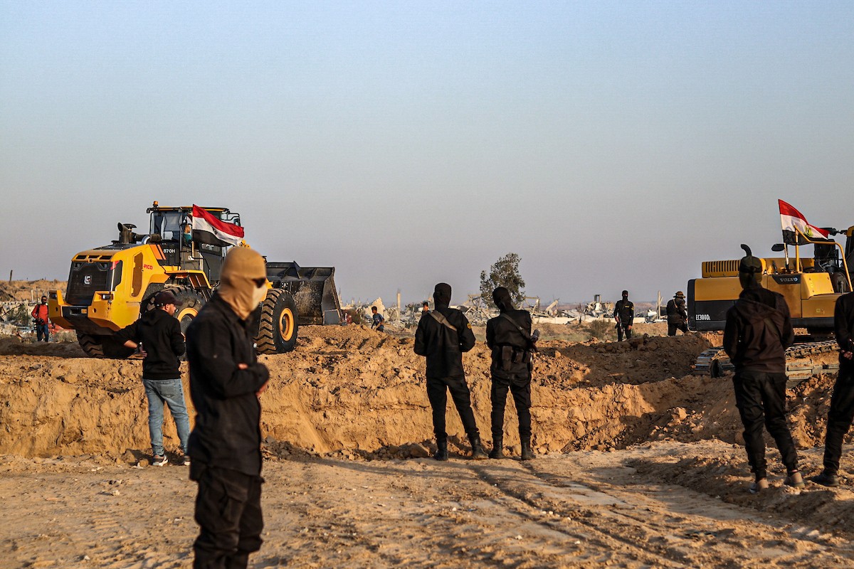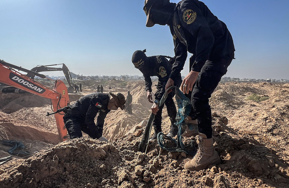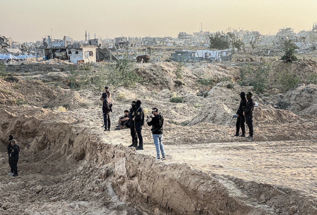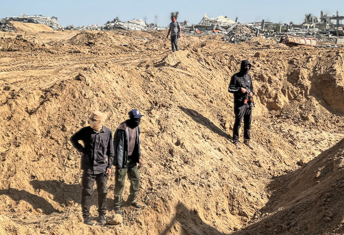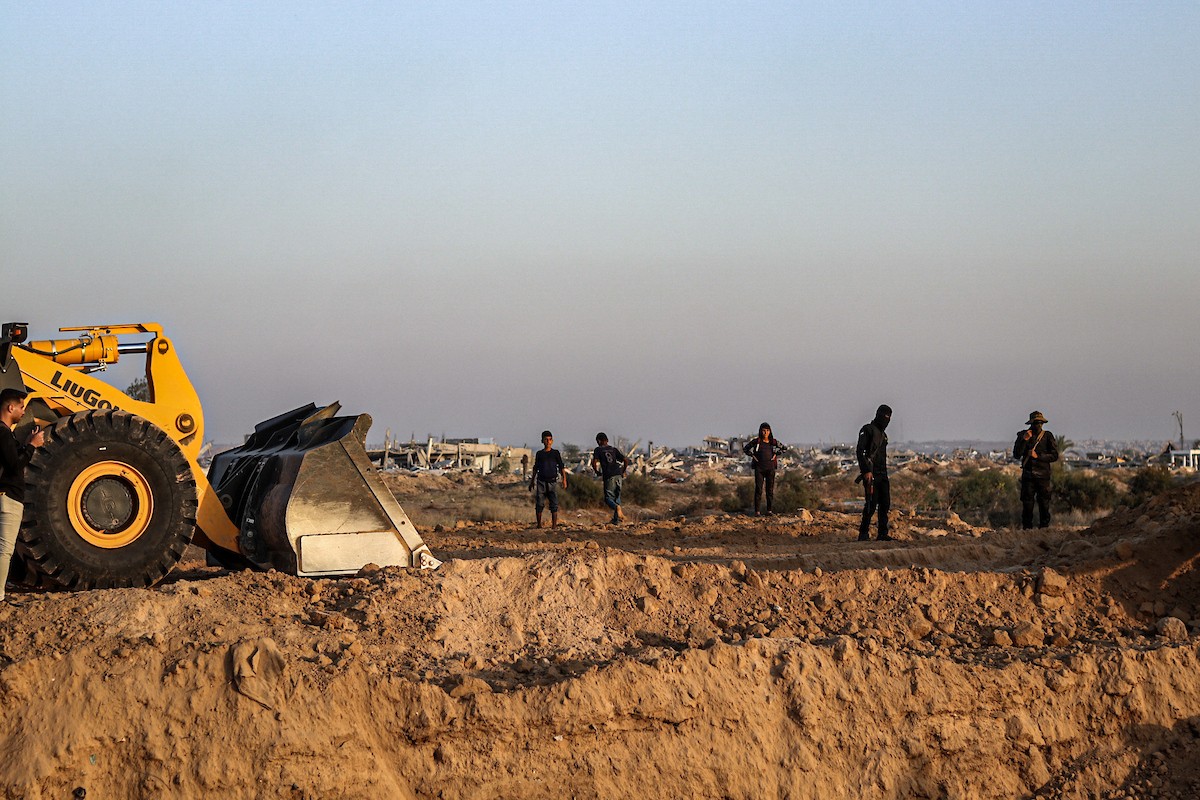 عناصر مسلحة من سرايا القدس وفرق تابعة للوفد المصري تعمل على البحث تحت الأنقاض عن رفات رهينة إسرائيلي في مخيم النصيرات وسط القطاع 20 نوفمبر 2025. تصوير: بلال أبو عامر