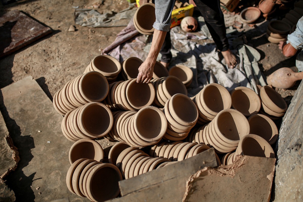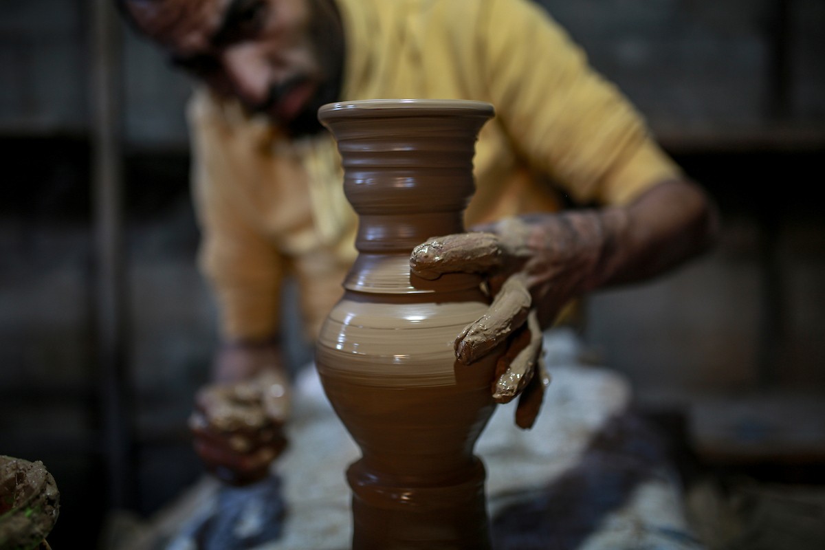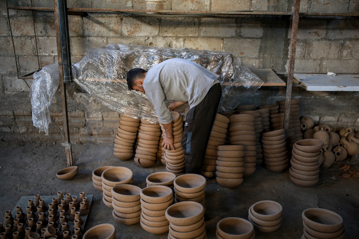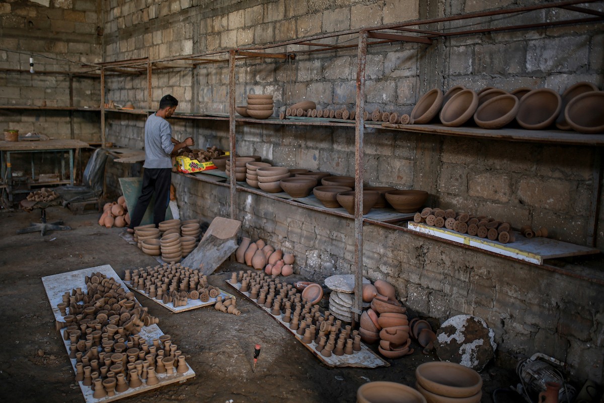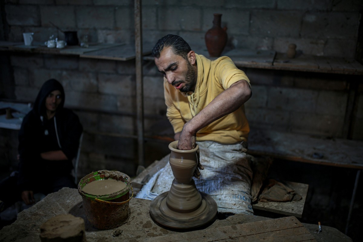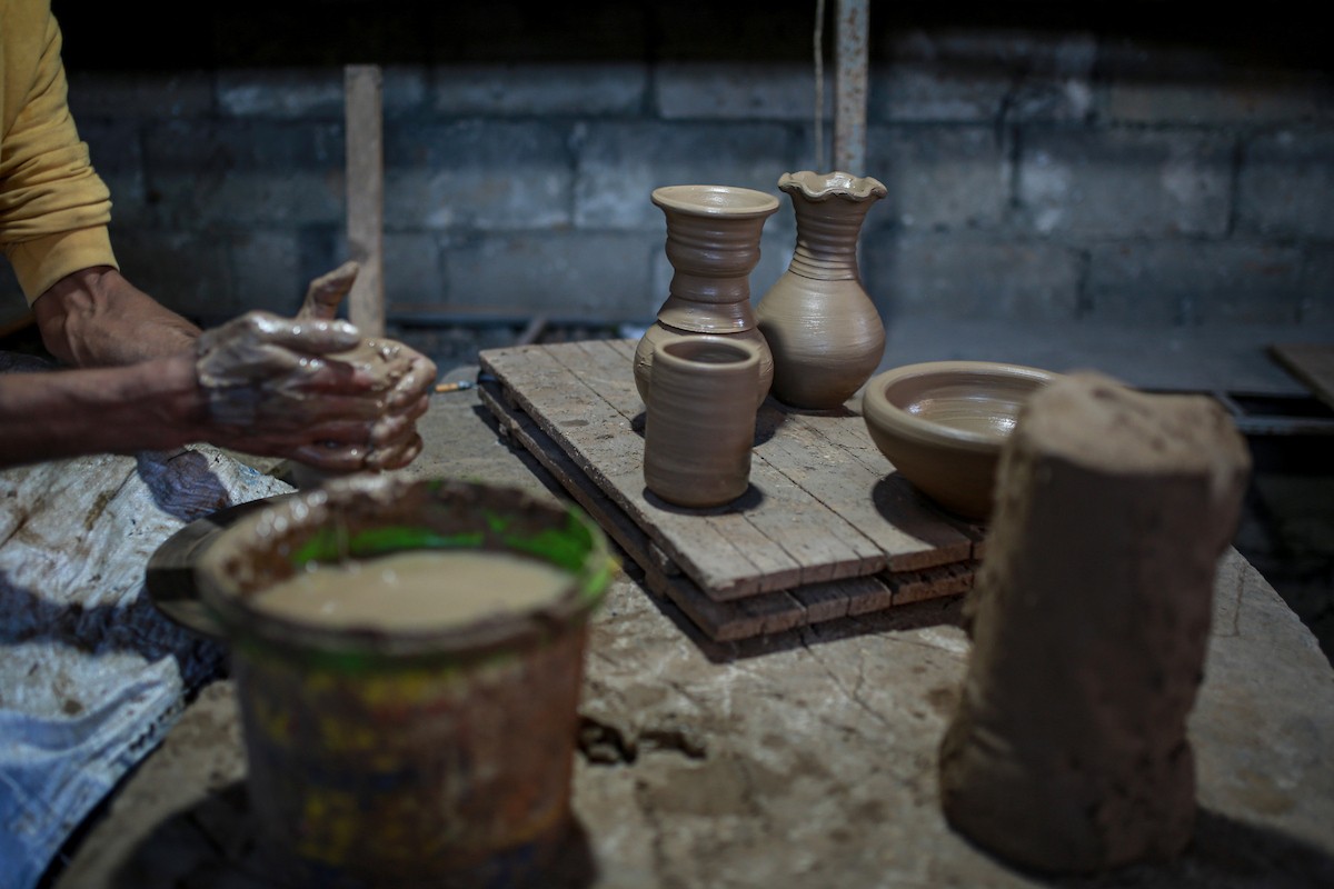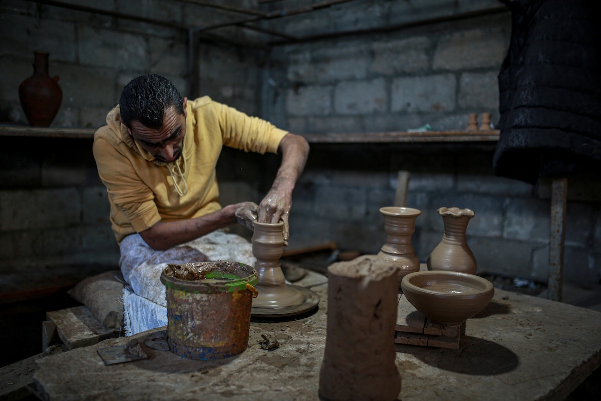 حرفيو الفخار الفلسطينيون يُنتجون أدوات منزلية وأدوات مائدة باستخدام أساليب حرفية تقليدية في مدينة غزة. تصوير: عمر أشتوي