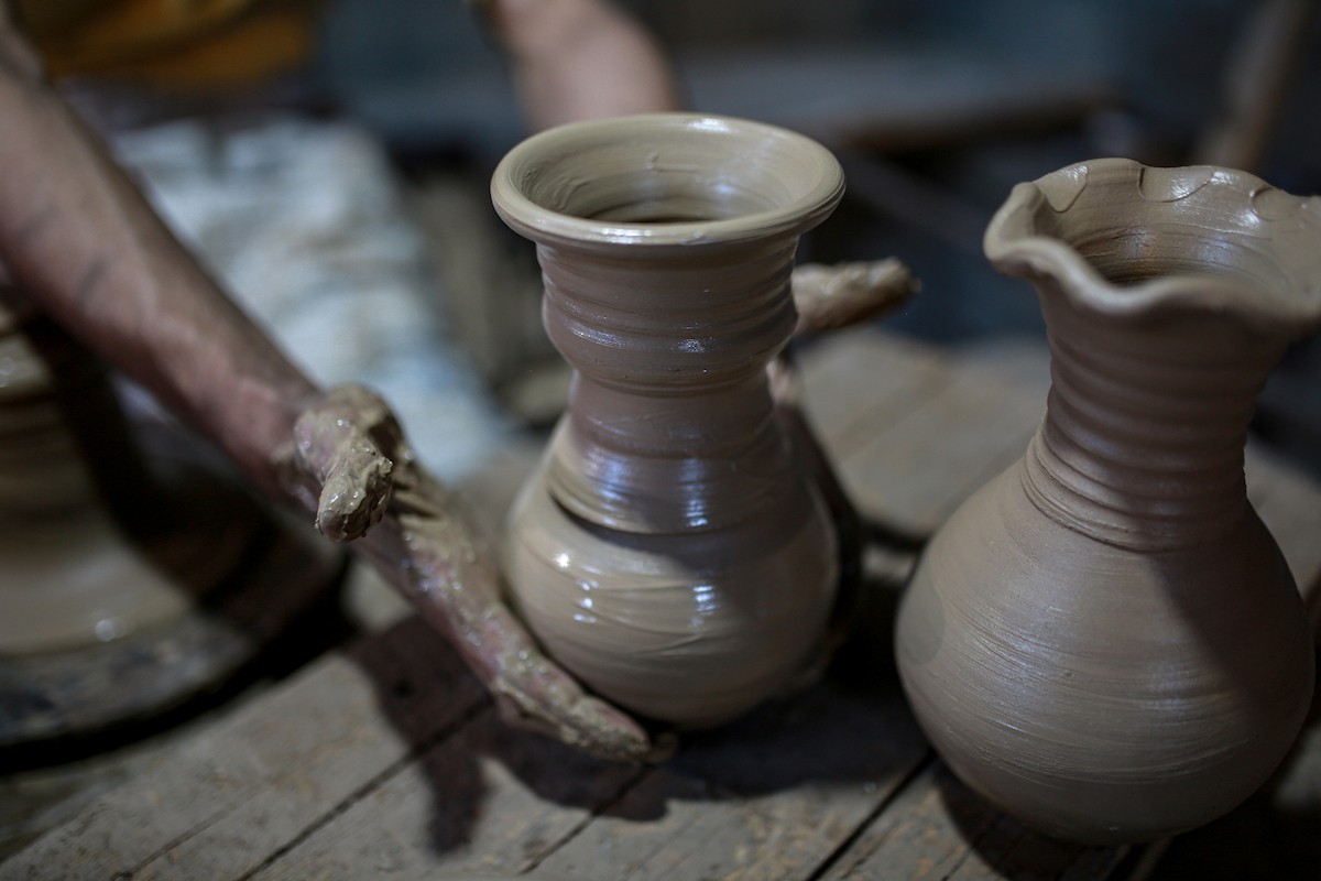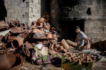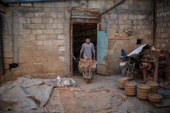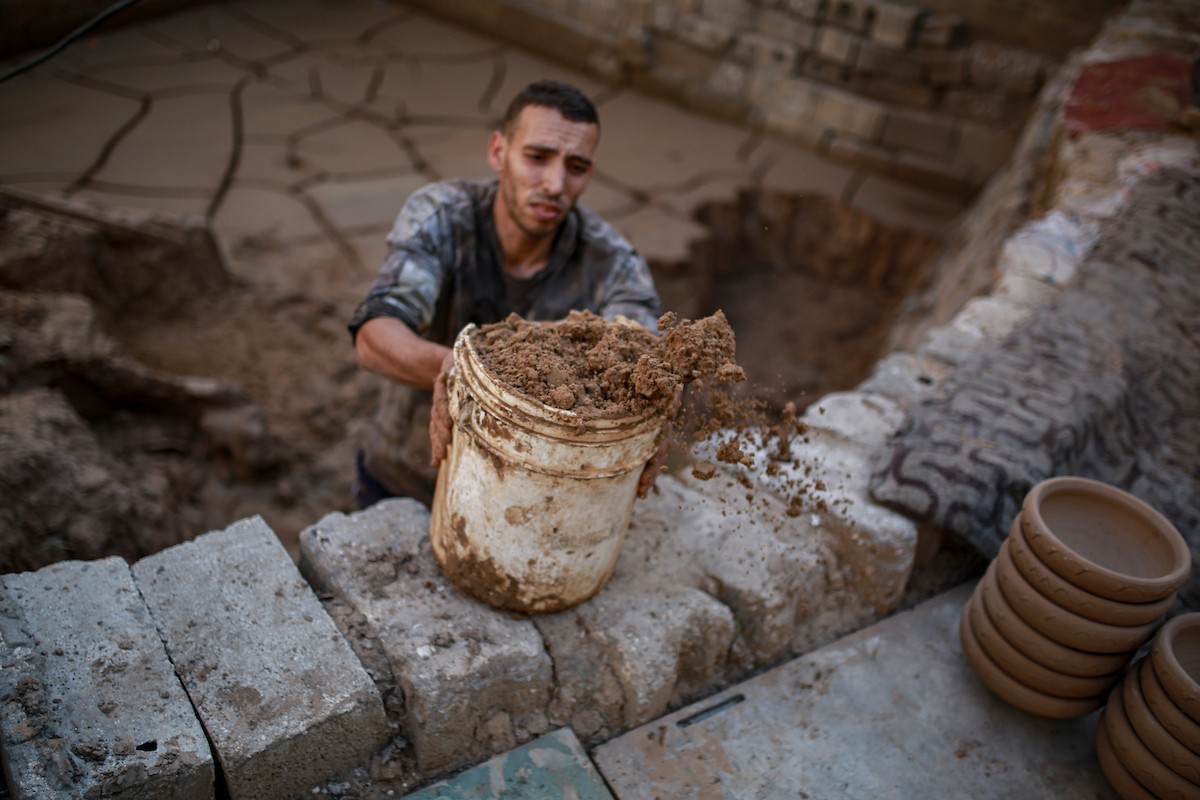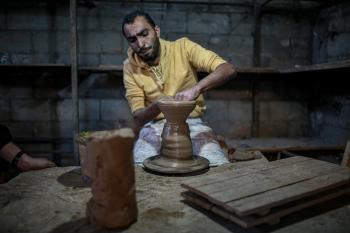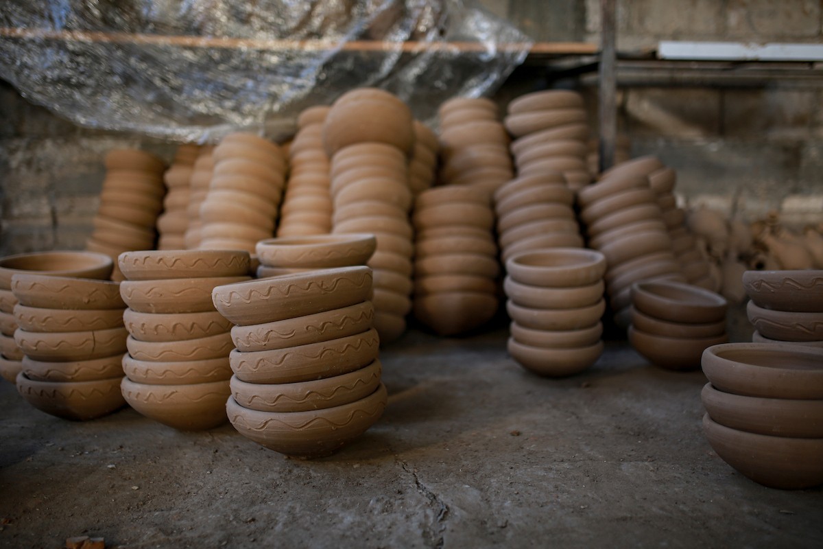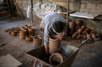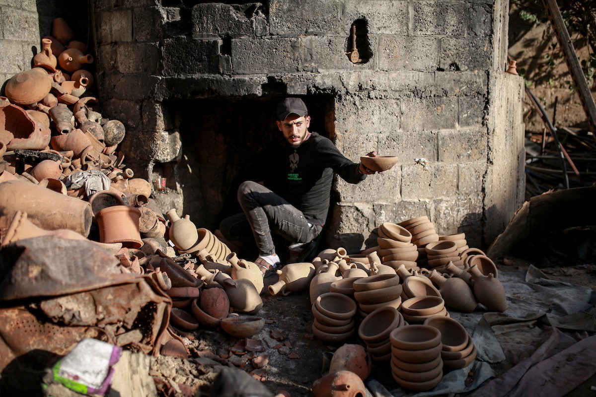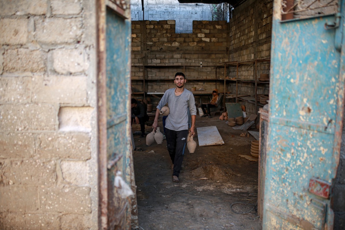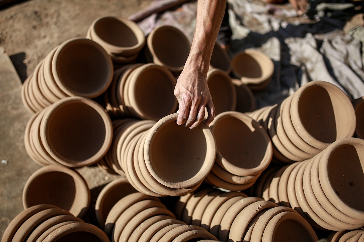 حرفيو الفخار الفلسطينيون يُنتجون أدوات منزلية وأدوات مائدة باستخدام أساليب حرفية تقليدية في مدينة غزة. تصوير: عمر أشتوي