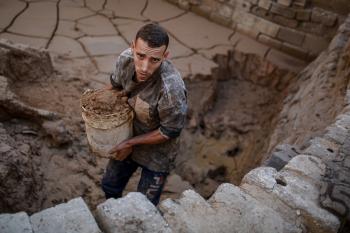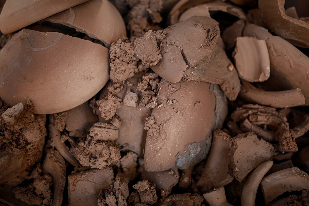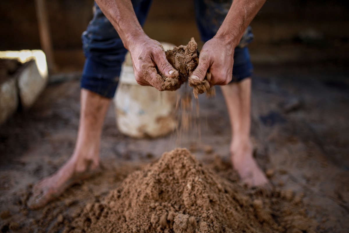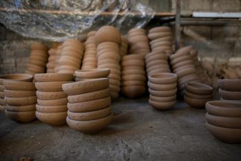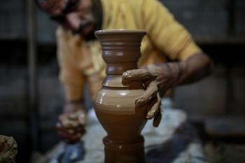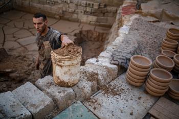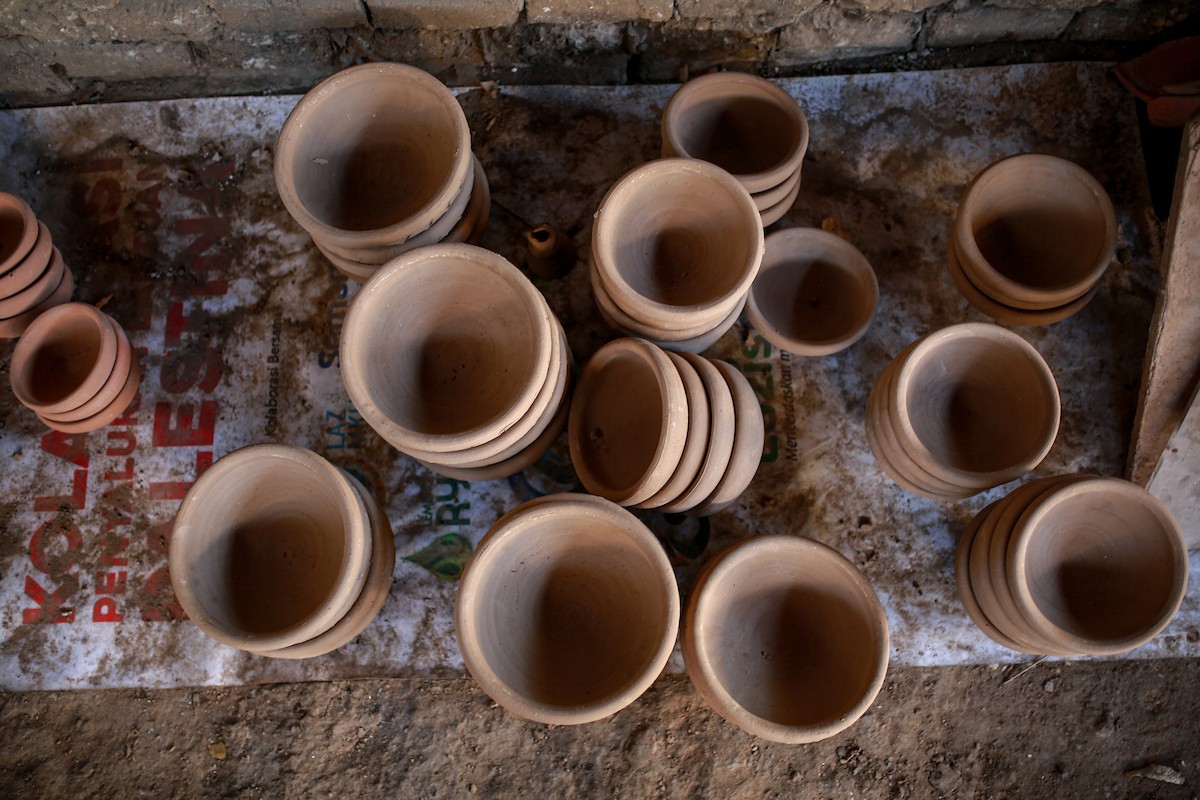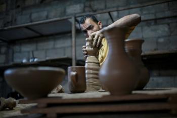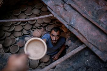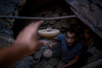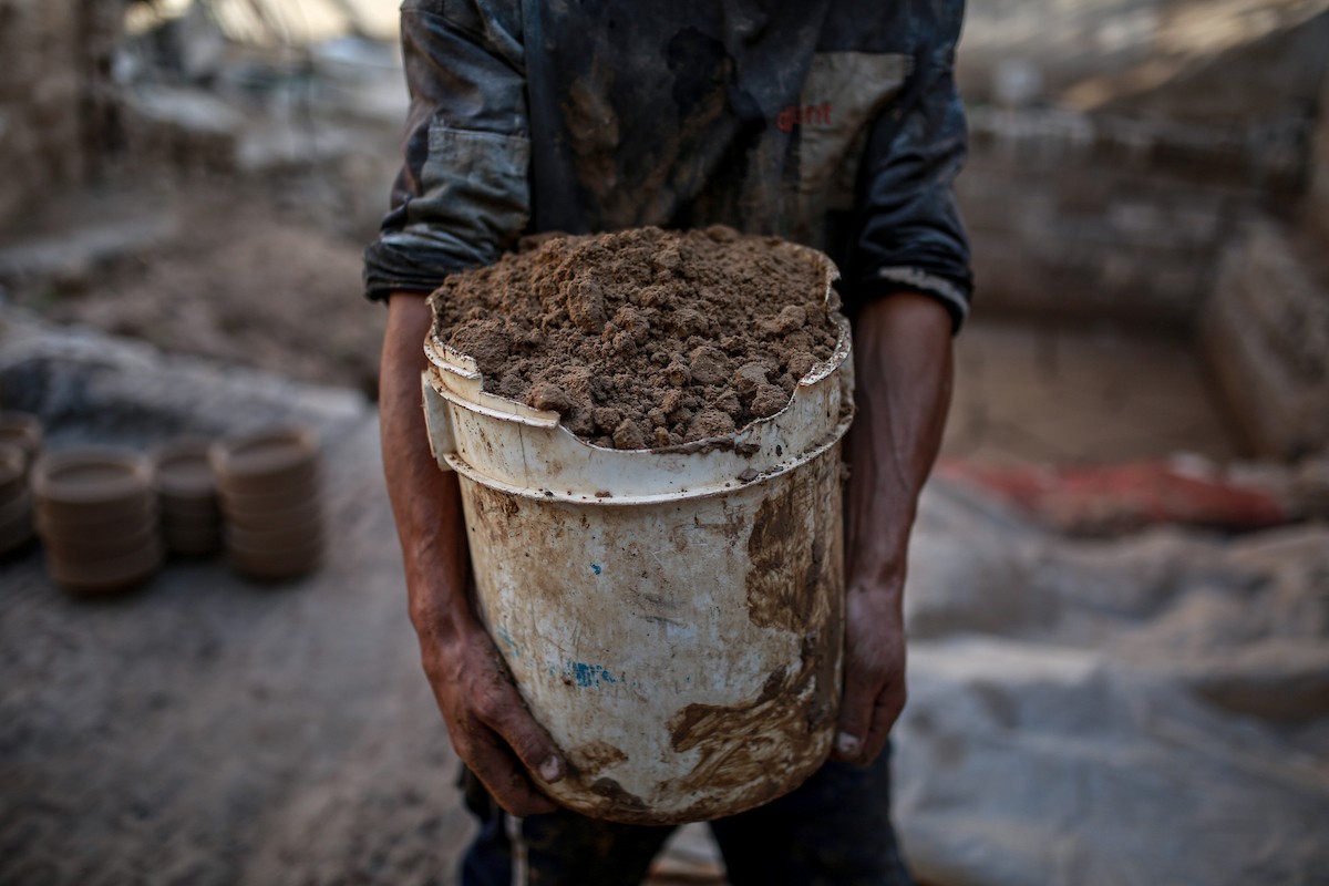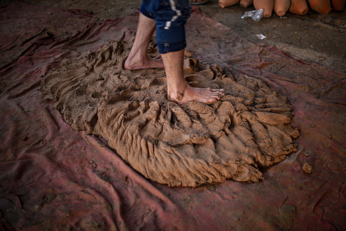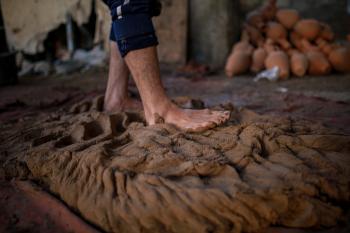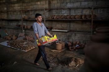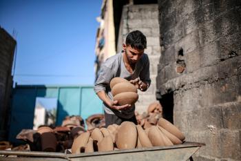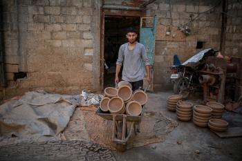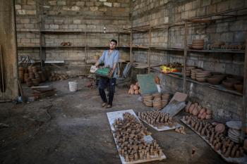 حرفيو الفخار الفلسطينيون يُنتجون أدوات منزلية وأدوات مائدة باستخدام أساليب حرفية تقليدية في مدينة غزة. تصوير: عمر أشتوي