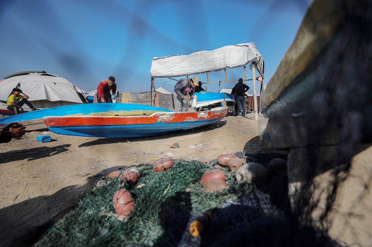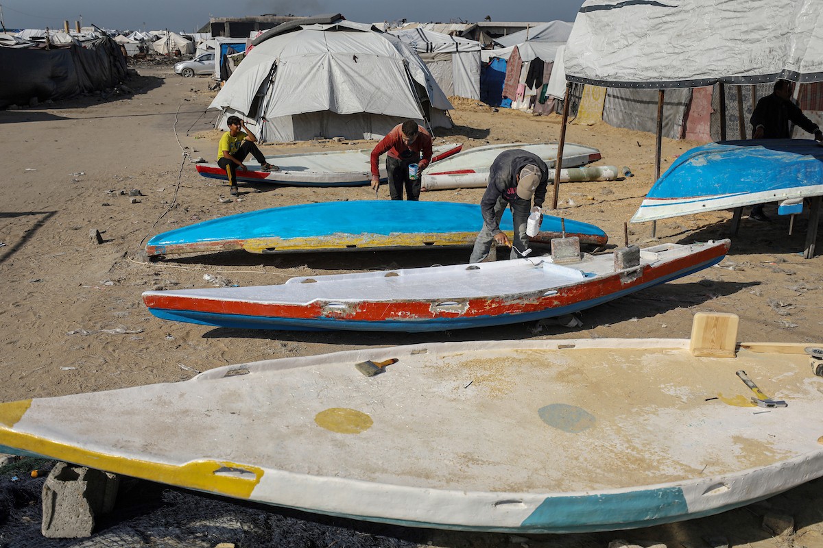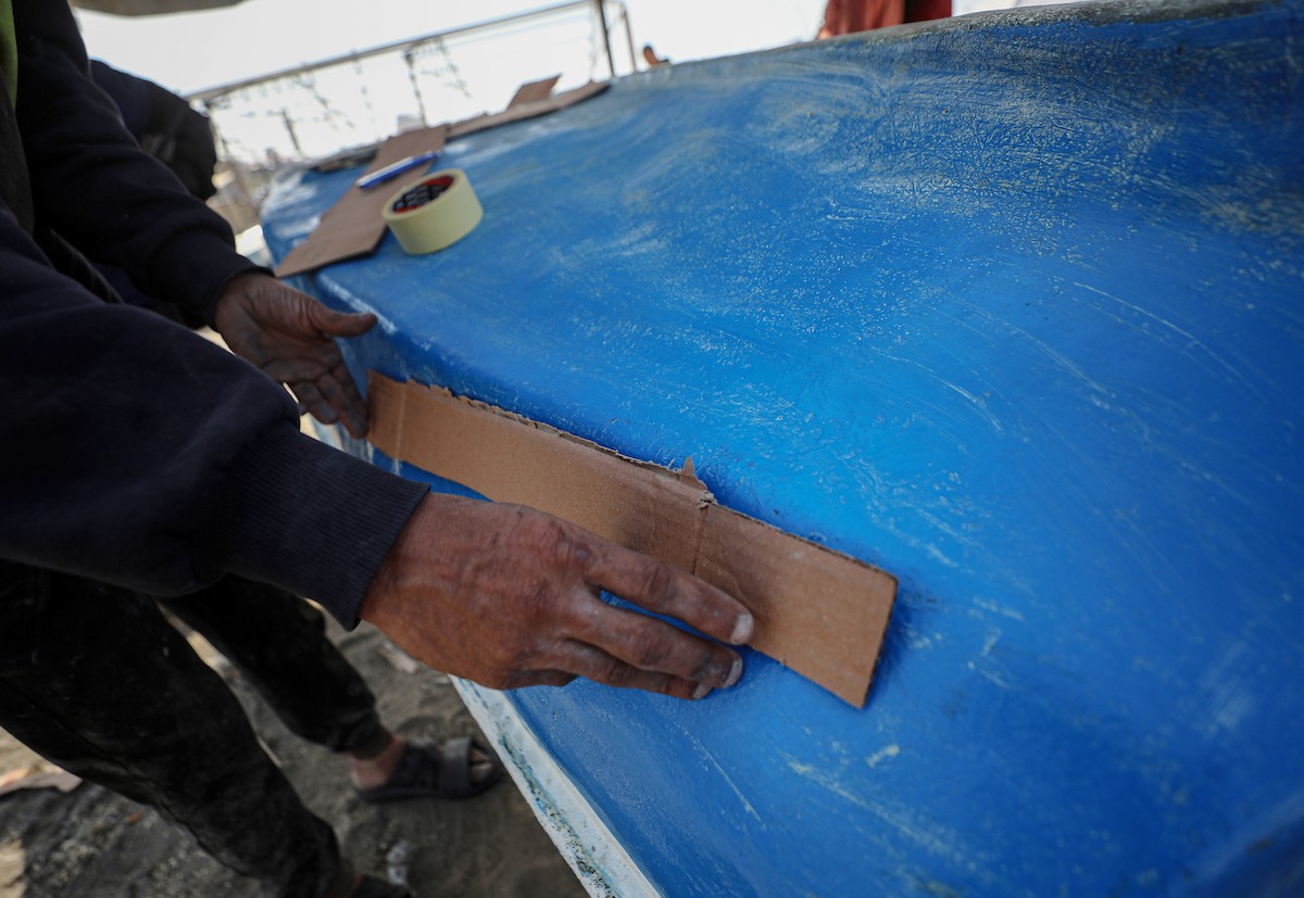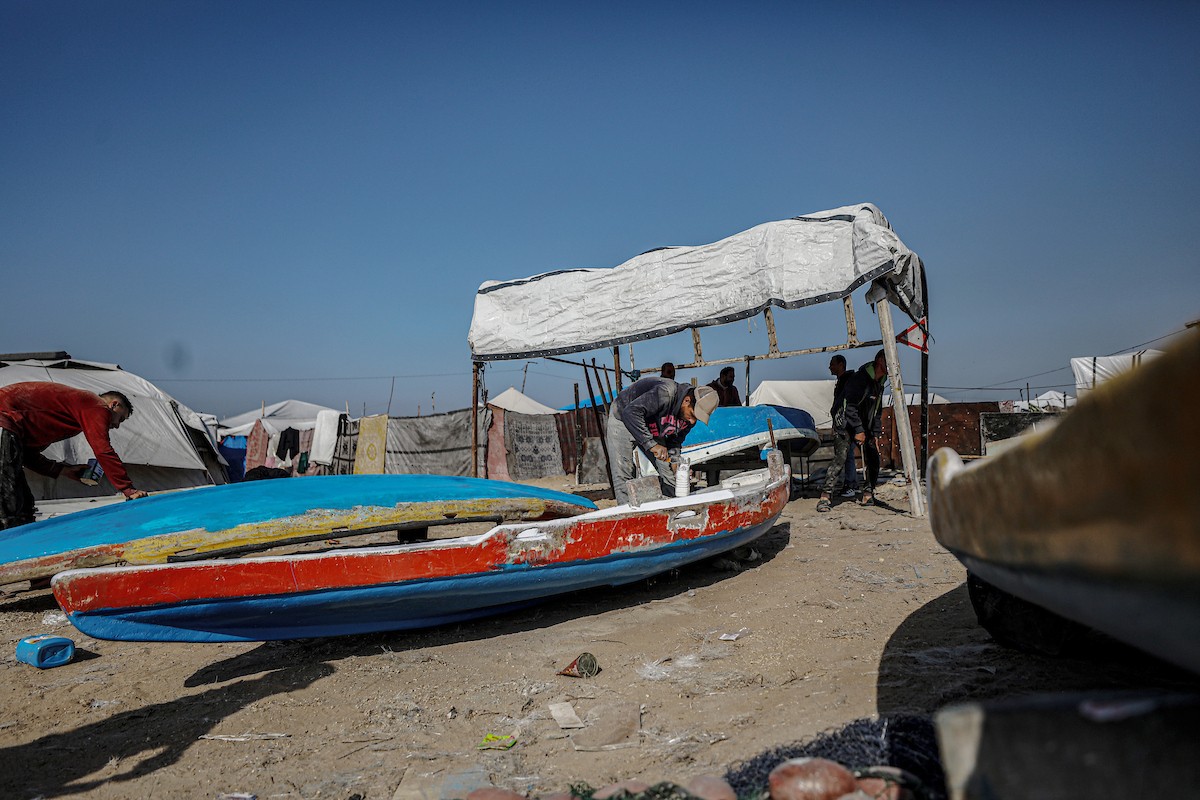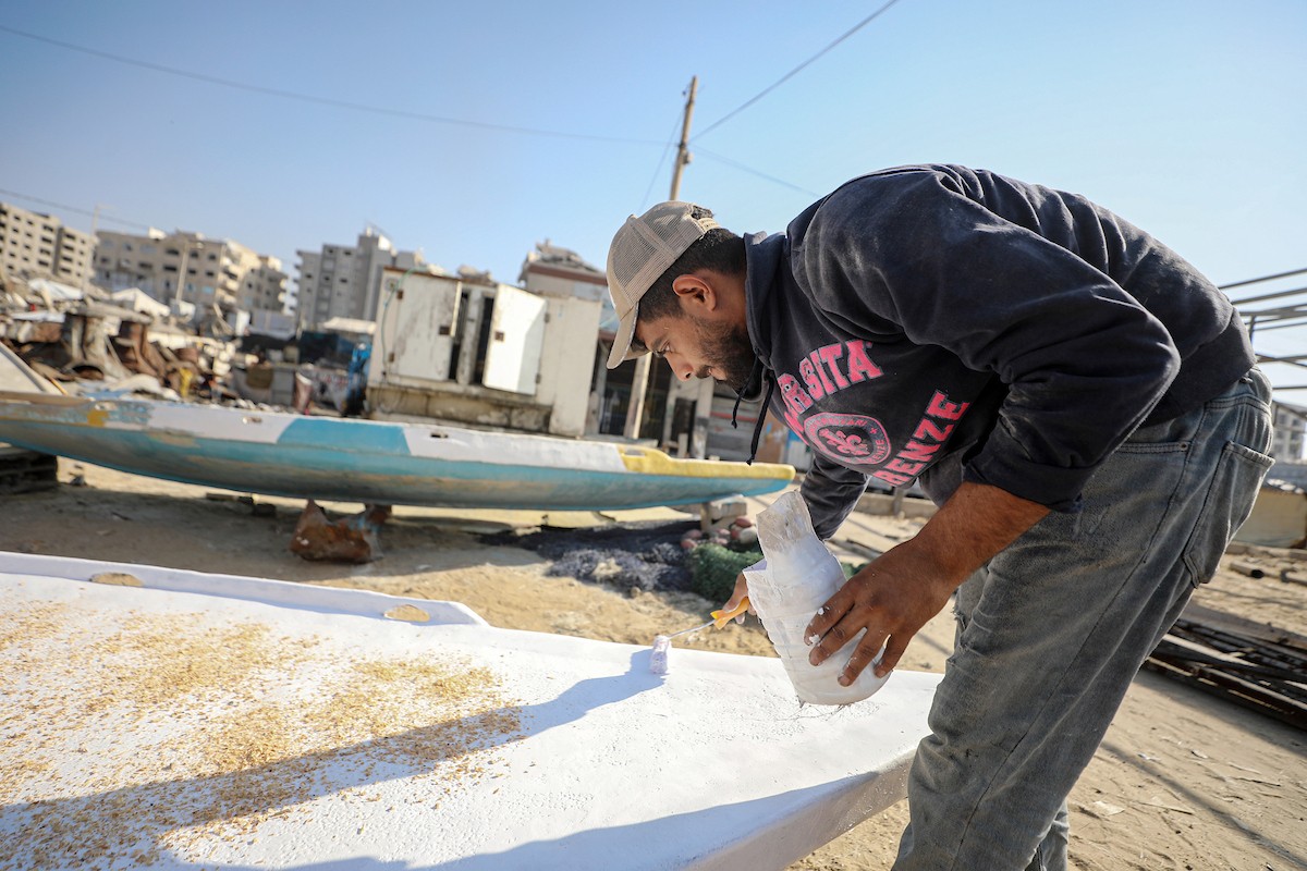 حرفيون يُصلحون قوارب الصيد في ورشة بميناء غزة البحري، 27 نوفمبر/تشرين الثاني 2025 . تصوير: عمر أشتوي