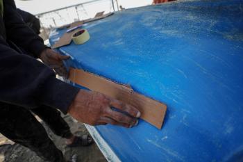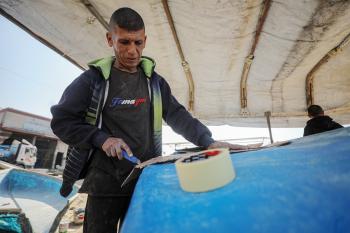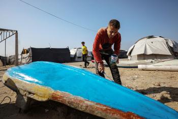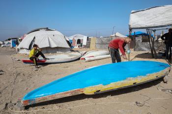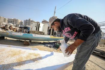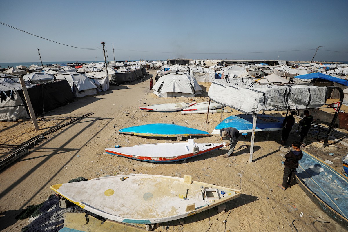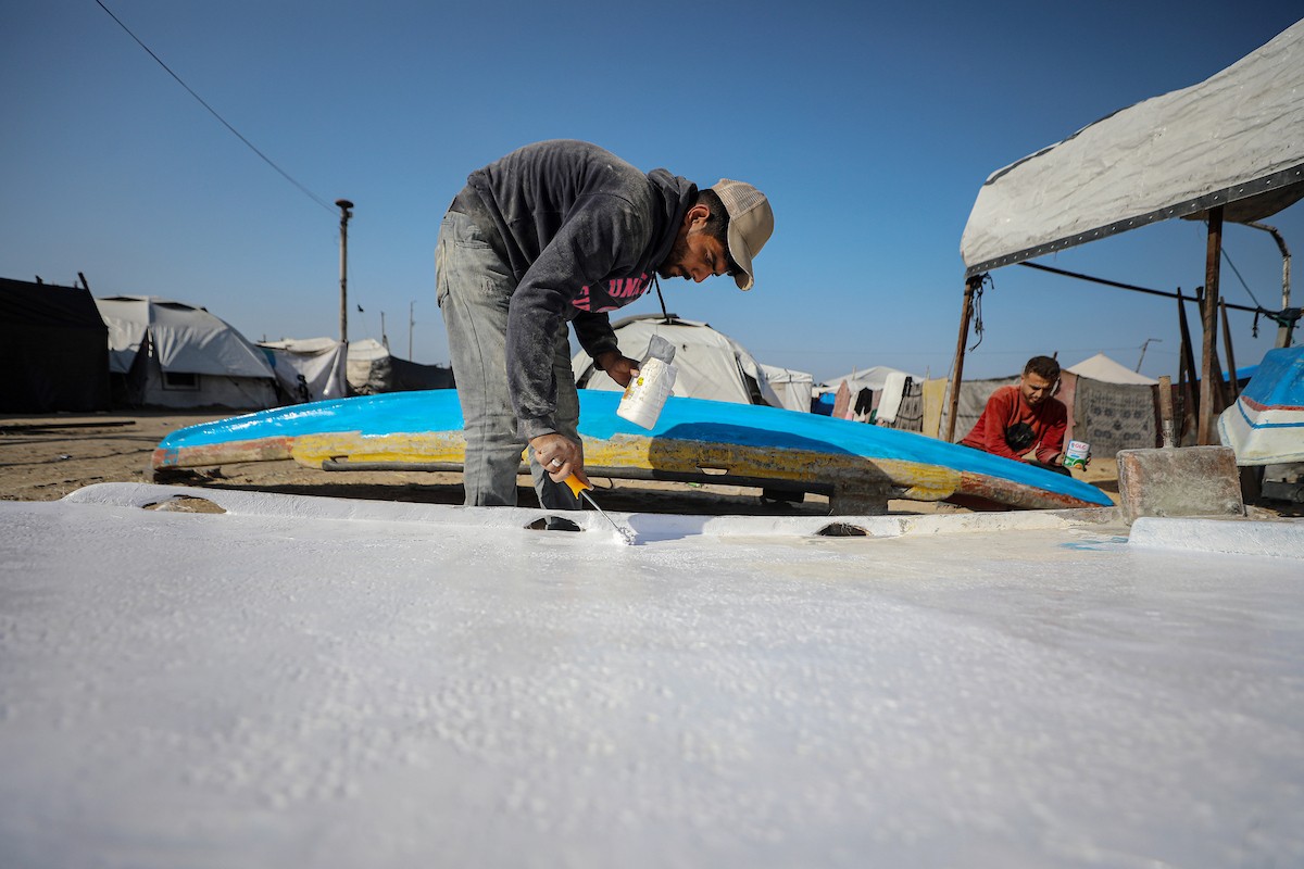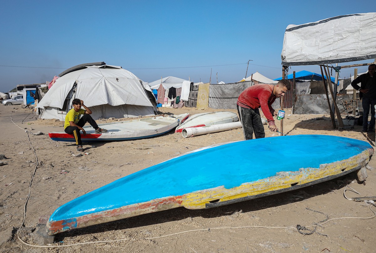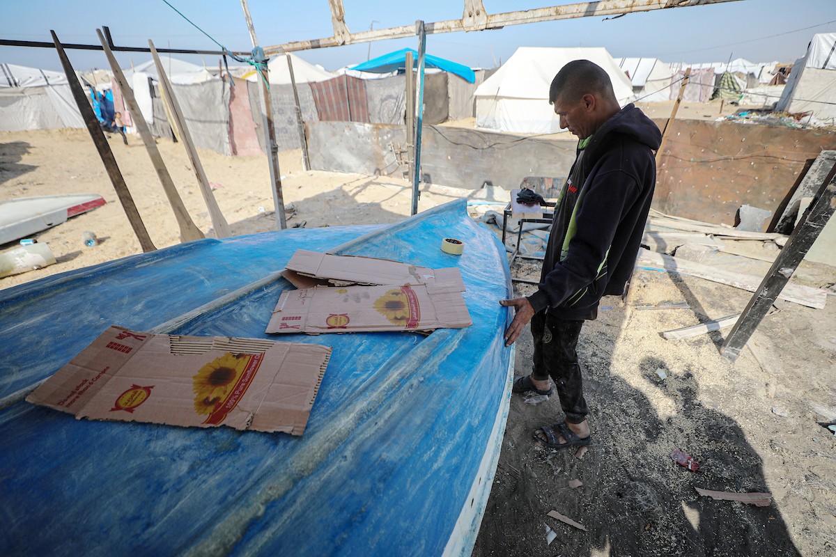 حرفيون يُصلحون قوارب الصيد في ورشة بميناء غزة البحري، 27 نوفمبر/تشرين الثاني 2025 . تصوير: عمر أشتوي
