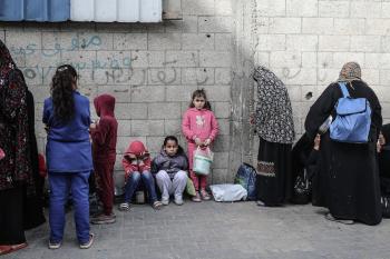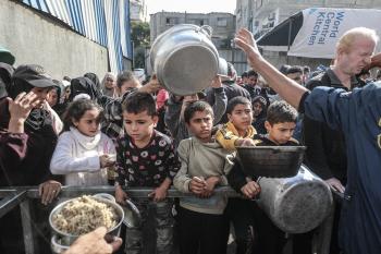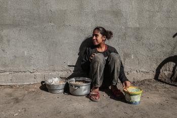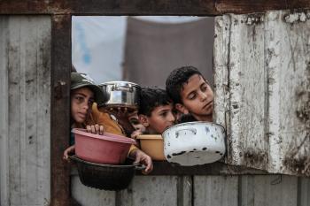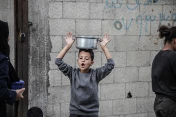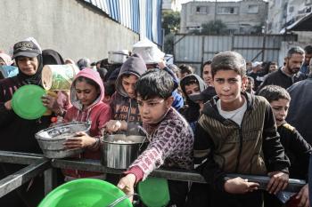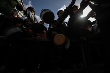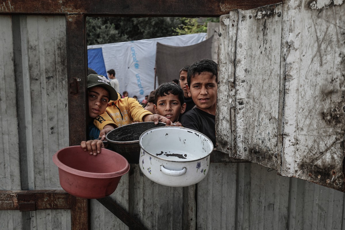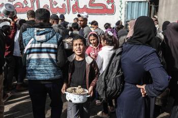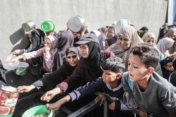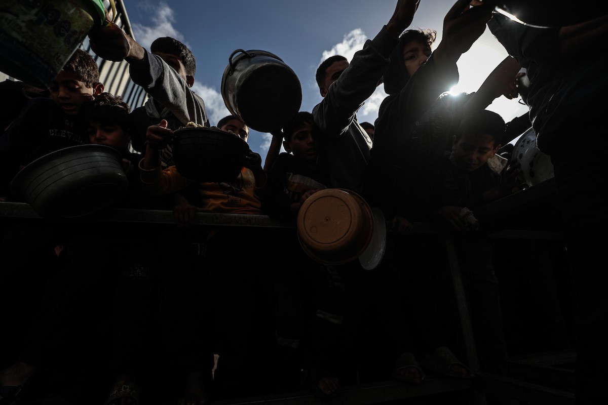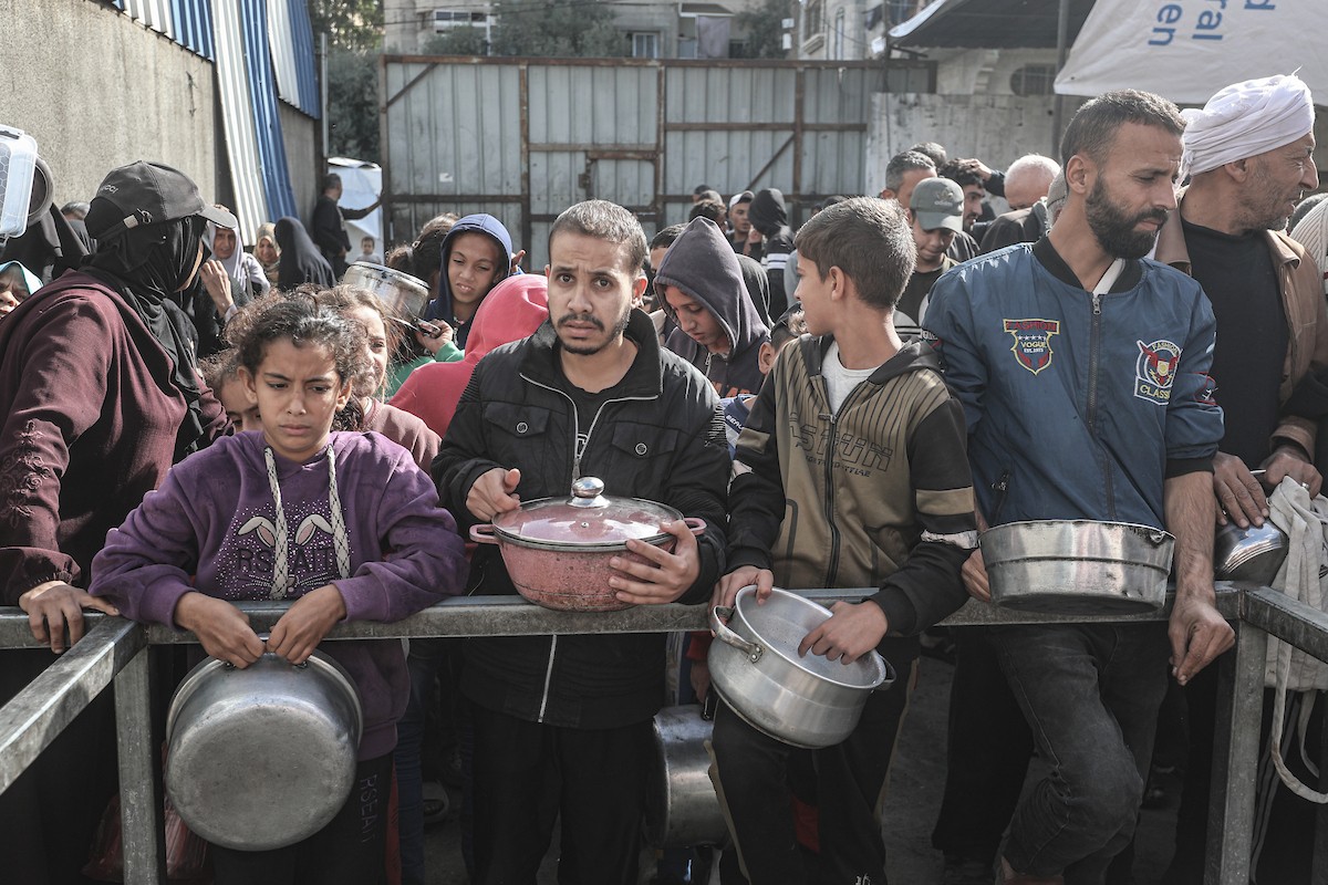 فلسطينيون في مخيم النصيرات يتلقون وجبات ساخنة من جمعية خيرية للنازحين، 30 نوفمبر/تشرين الثاني 2025. تصوير: معز صالحي