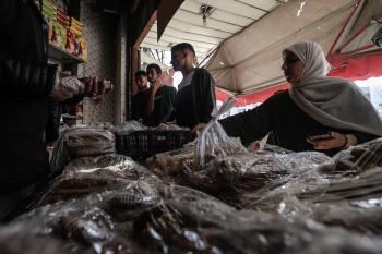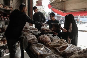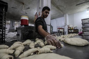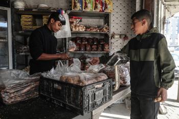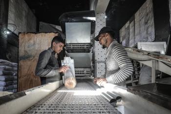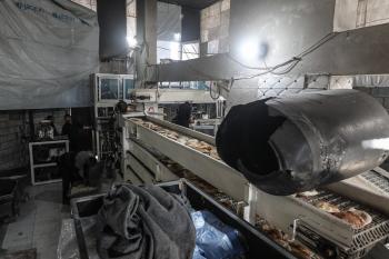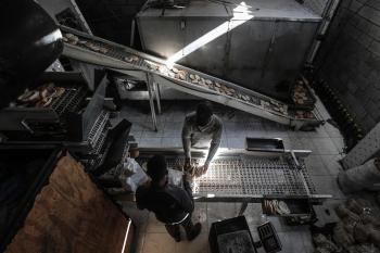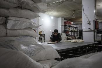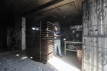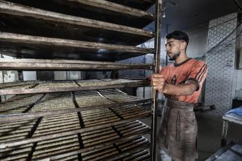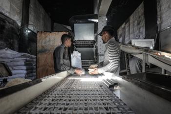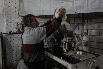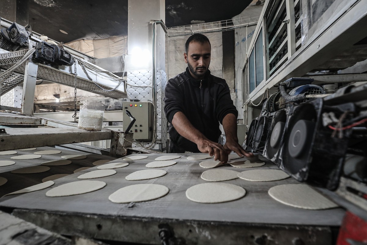 عمال فلسطينيون يعيدون تشغيل أحد أقدم المخابز في مخيم النصيرات للاجئين بعد إغلاقه لمدة عامين بسبب الحرب. 2 ديسمبر/كانون الأول 2025.تصوير: معز صالحي