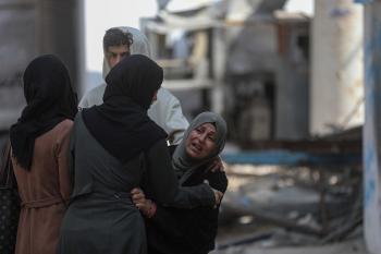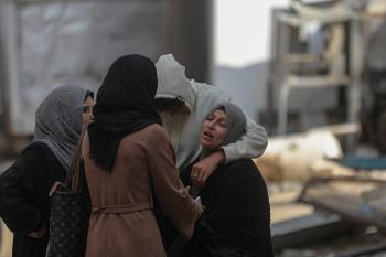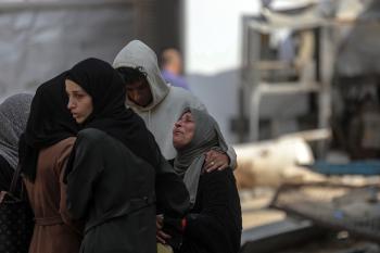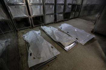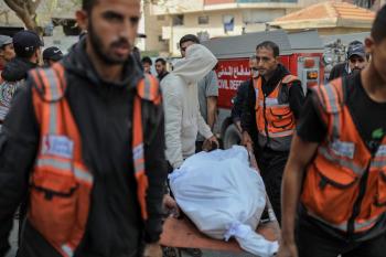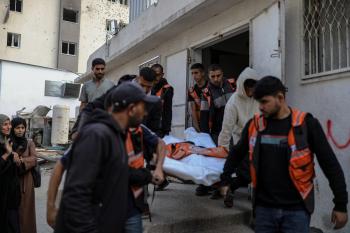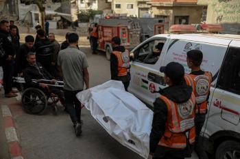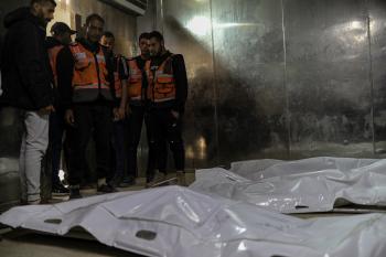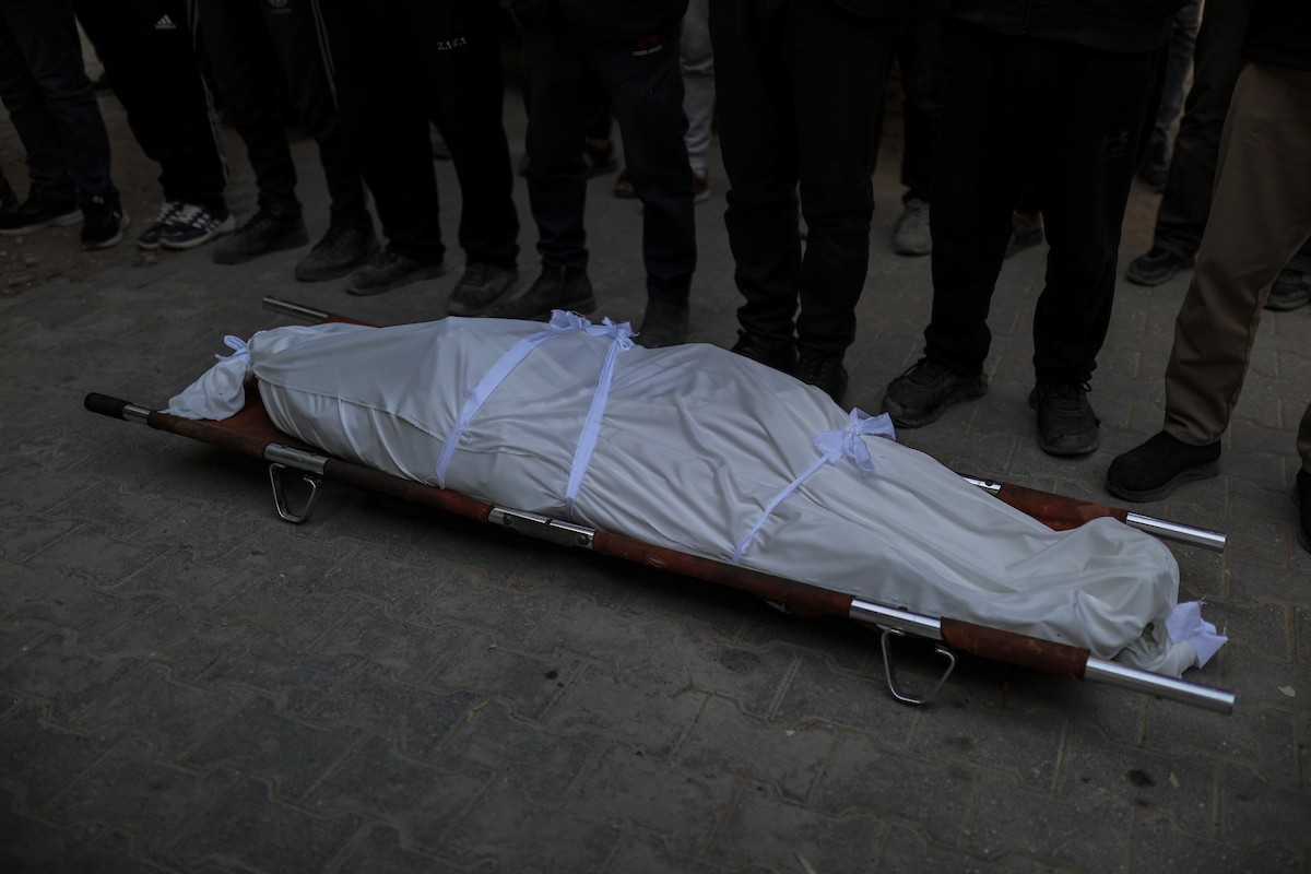 فلسطينيون ينعون ويحملون جثامين عدد من الشهداء في غارة إسرائيلية على بيت لاهيا، خلال جنازة في مستشفى الشفاء بمدينة غزة، 6 ديسمبر/كانون الأول 2025. تصوير: عمر أشتوي