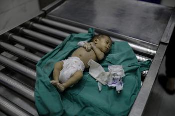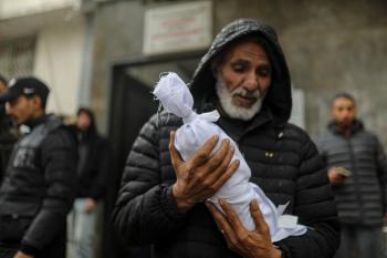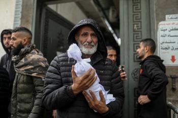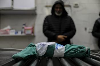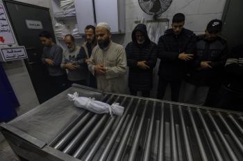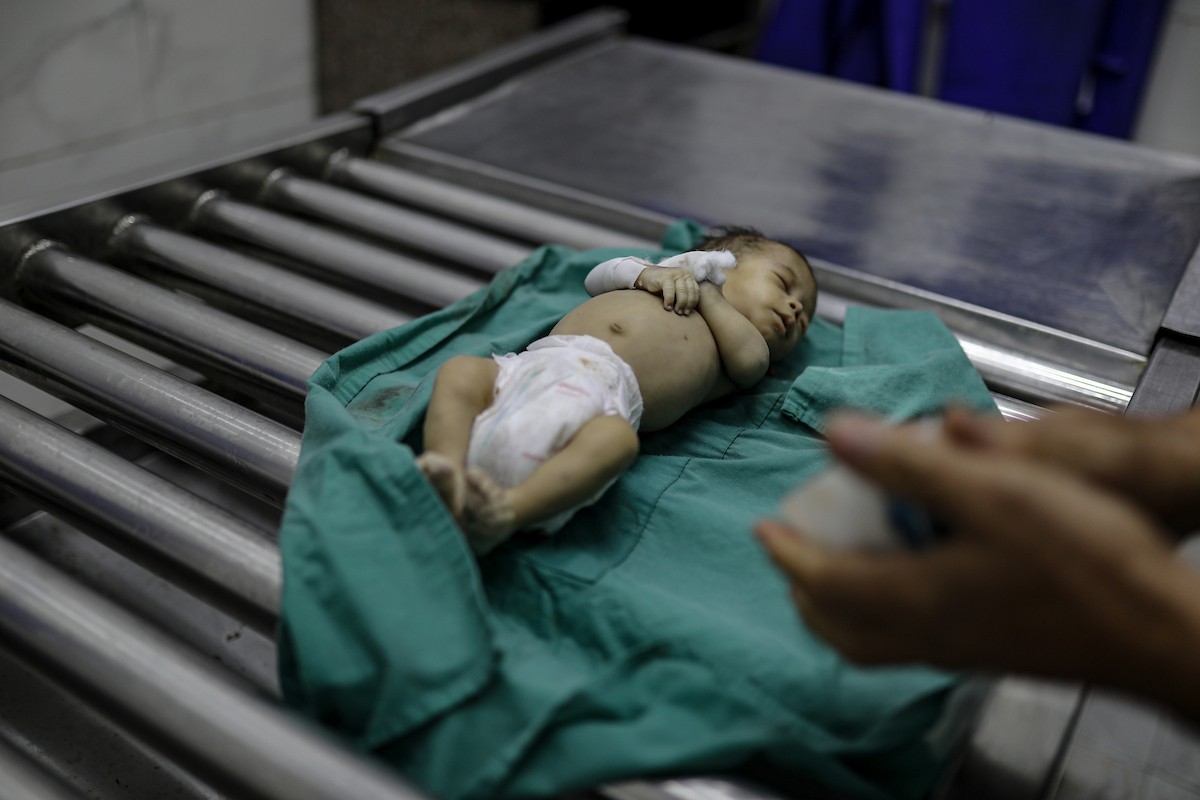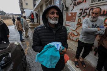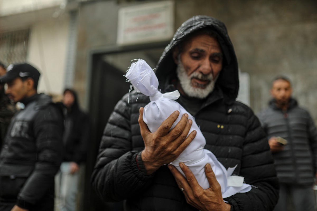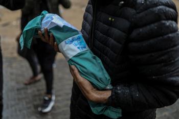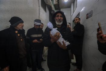 وفاة رضيع يبلغ من العمر ثلاثة أشهر، يُدعى تيم الخواجة، كان يعيش في خيمة بمخيم الشاطئ غرب مدينة غزة، نتيجةً لظروف الطقس الباردة في شمال قطاع غزة، في 12 ديسمبر/كانون الأول 2025. تصوير : عمر أشتوي
