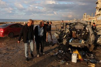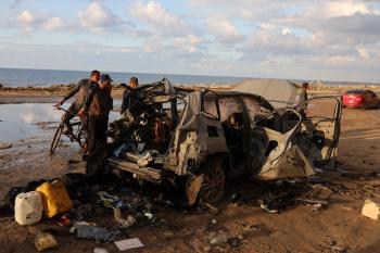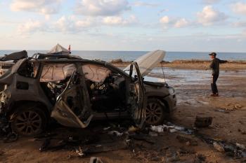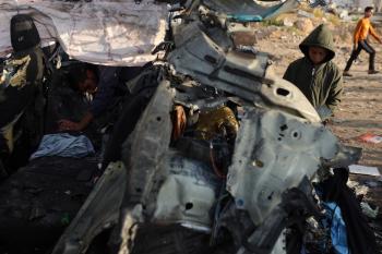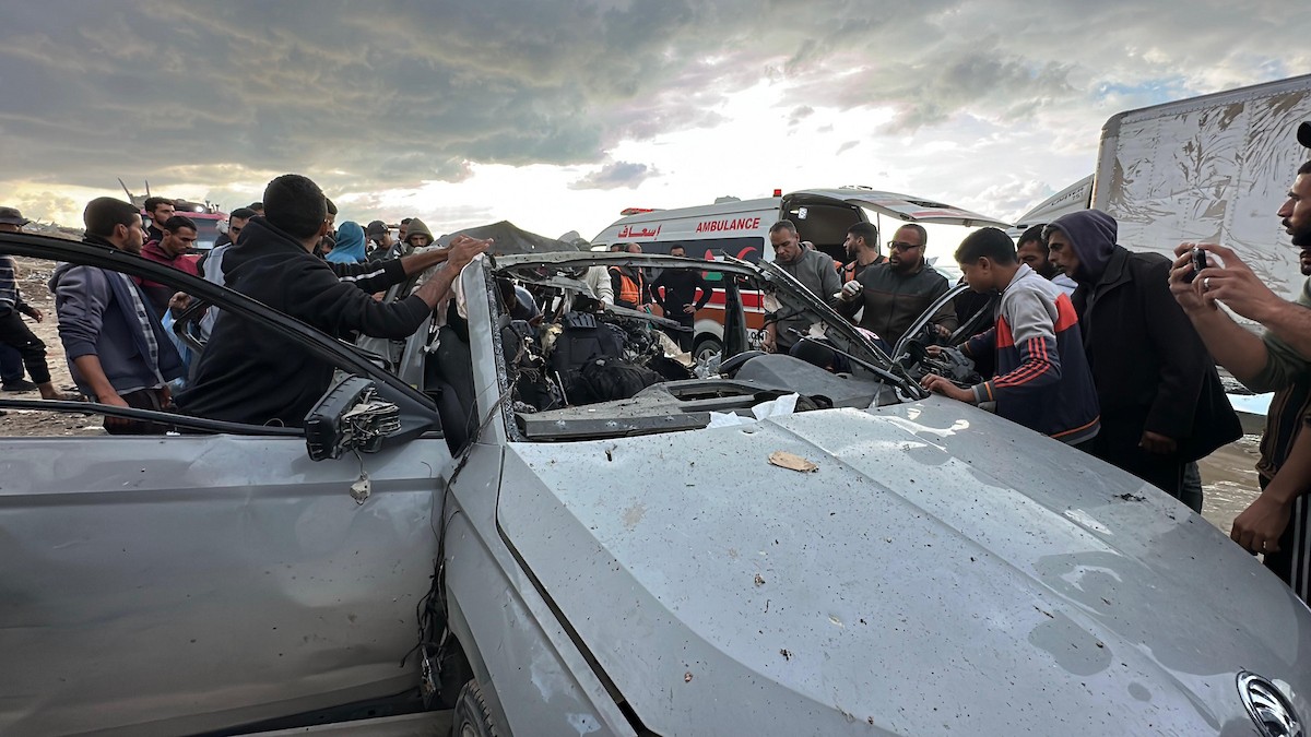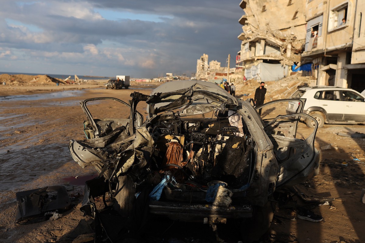 فلسطينيون يتفقدون موقع غارة إسرائيلية استهدفت سيارة على شارع الرشيد غرب مدينة غزة، 13 ديسمبر/كانون الأول 2025. صور: عمر أشتوي