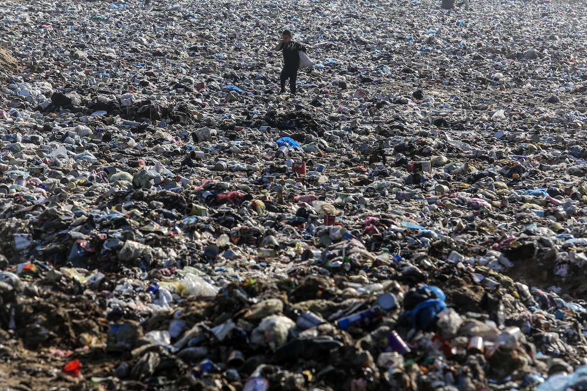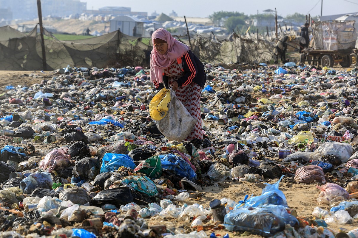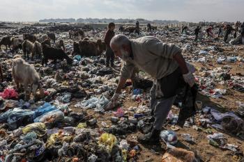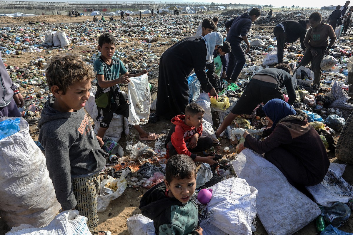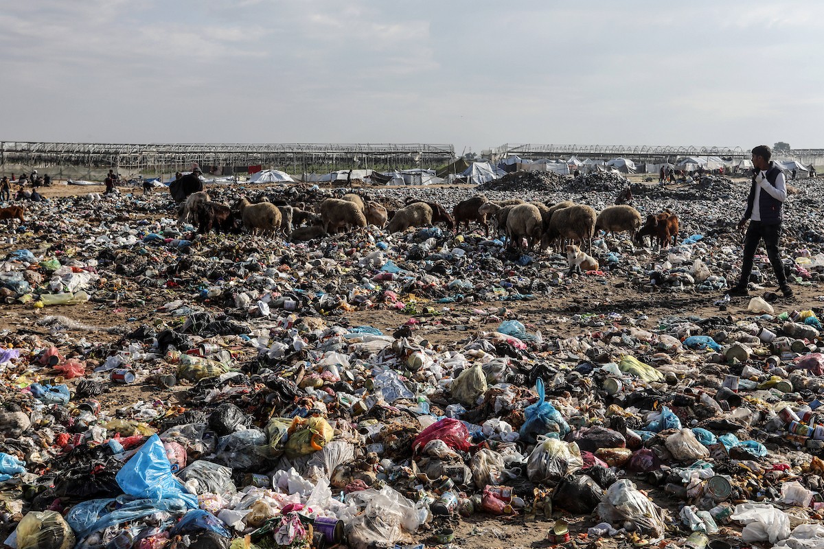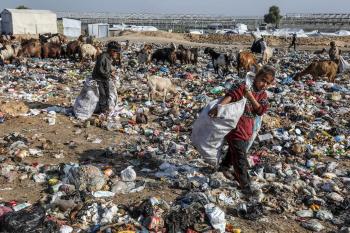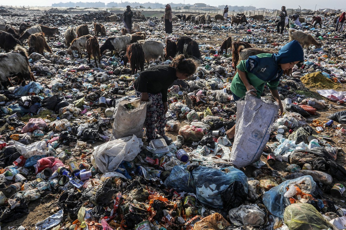 نازحون فلسطينيون يبحثون في القمامة في مكب النفايات شمال خان يونس جنوب قطاع غزة ، بحثًا عن البلاستيك أو الورق لإشعال النار للطهي، بسبب انقطاع الغاز. ١٣ ديسمبر/كانون الأول ٢٠٢٥، ( عبد رحيم خطيب/وكالة الأنباء الألمانية عبر زوما برس)