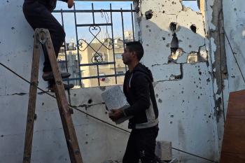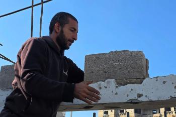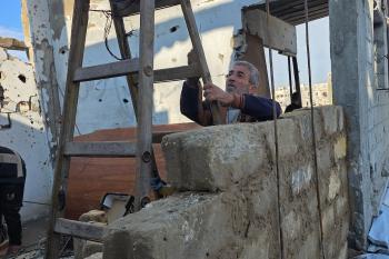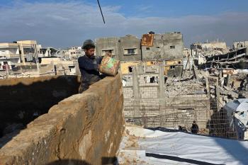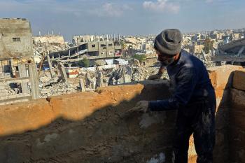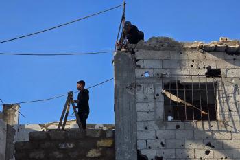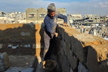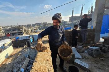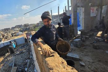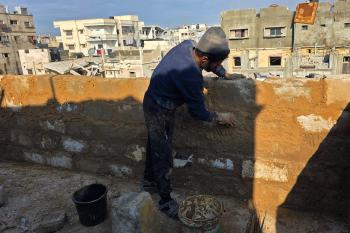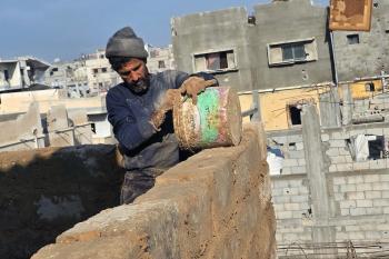 بناء بيوت طينية في خان يونس بأدوات وأساليب بدائية في محاولة لتوفير مأوى آمن من برد الشتاء القارس.15 ديسمبر/كانون الأول 2025. تصوير: طارق محمد
