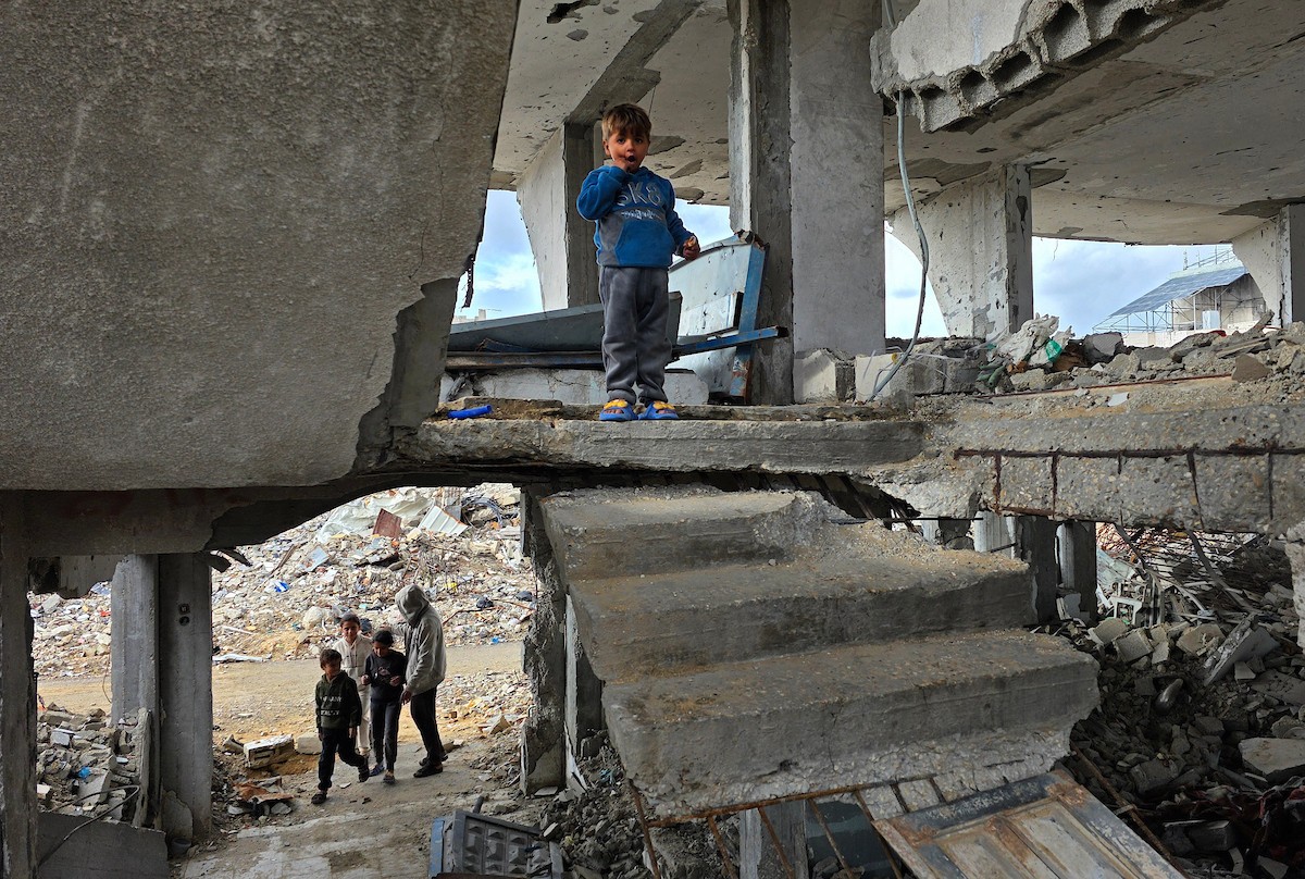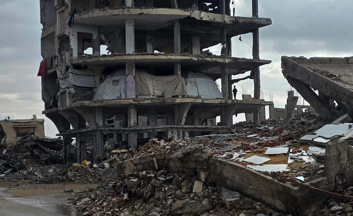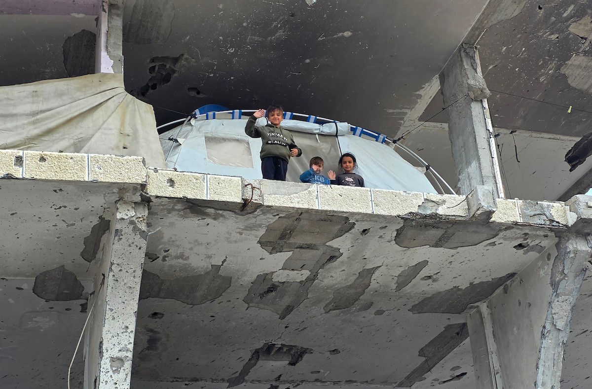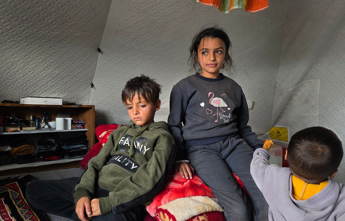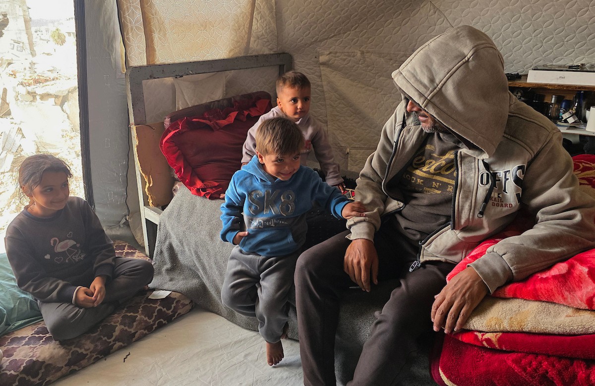 عائلة فلسطينية تحتمي من برد الشتاء القارس في خيمة نصبتها فوق منزلها المدمر قرب الخط الأصفر في خان يونس، ١٧ ديسمبر/كانون الأول ٢٠٢٥. تصوير: طارق محمد/وكالة الأنباء الفلسطينية (APA ).
