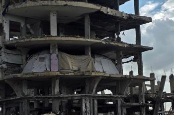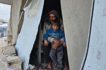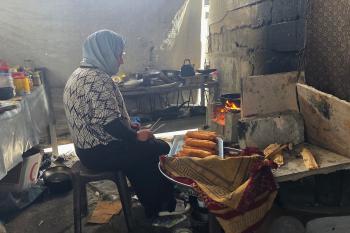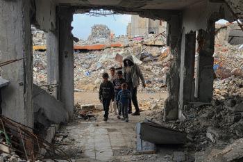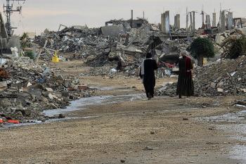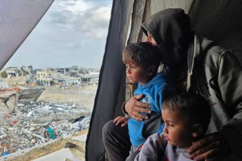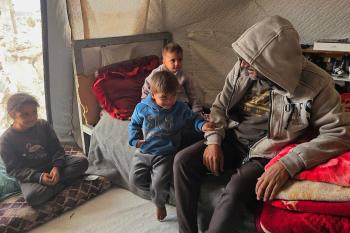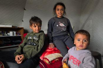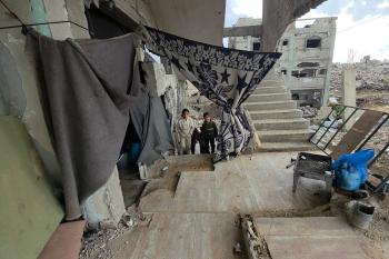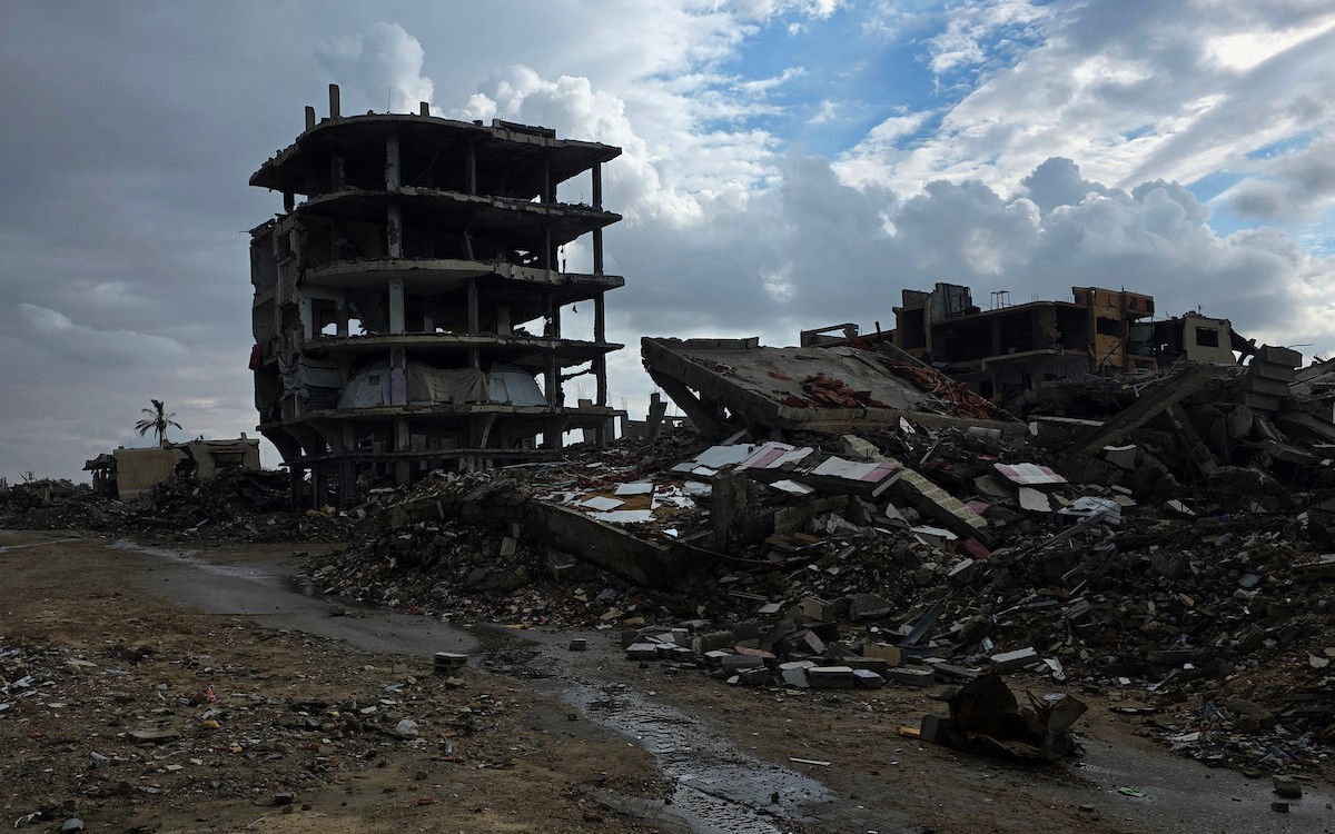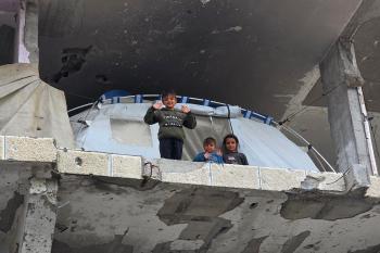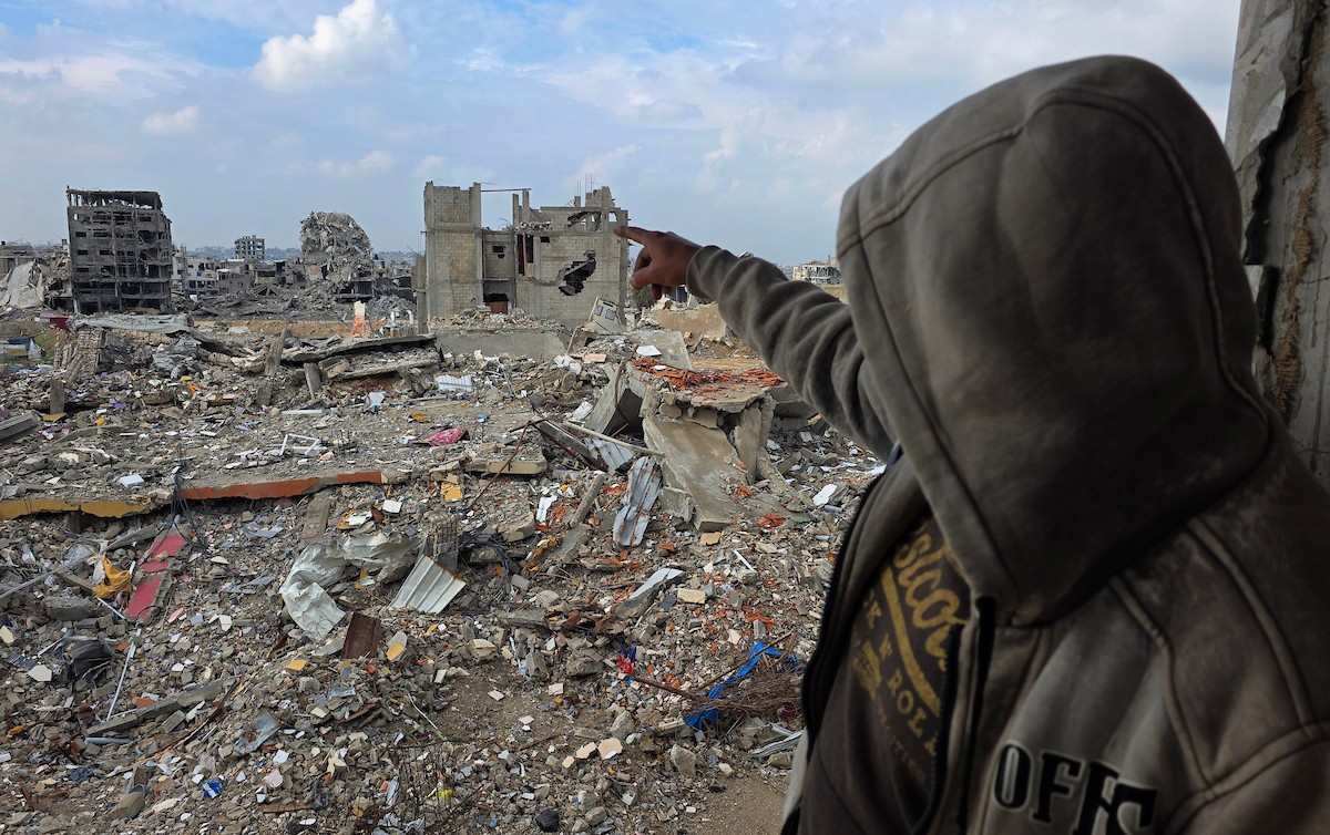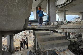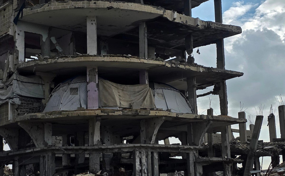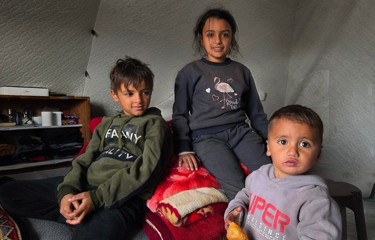 عائلة فلسطينية تحتمي من برد الشتاء القارس في خيمة نصبتها فوق منزلها المدمر قرب الخط الأصفر في خان يونس، ١٧ ديسمبر/كانون الأول ٢٠٢٥. تصوير: طارق محمد/وكالة الأنباء الفلسطينية (APA ).