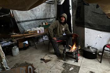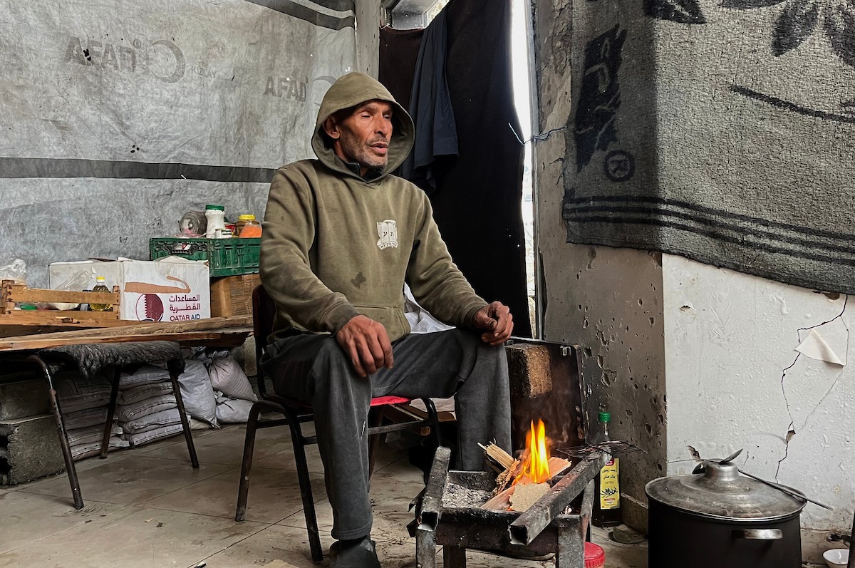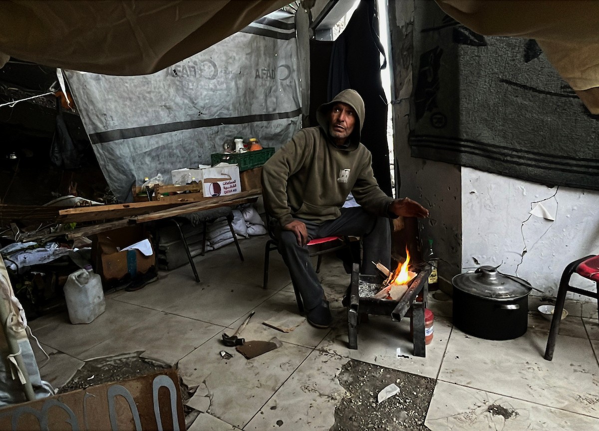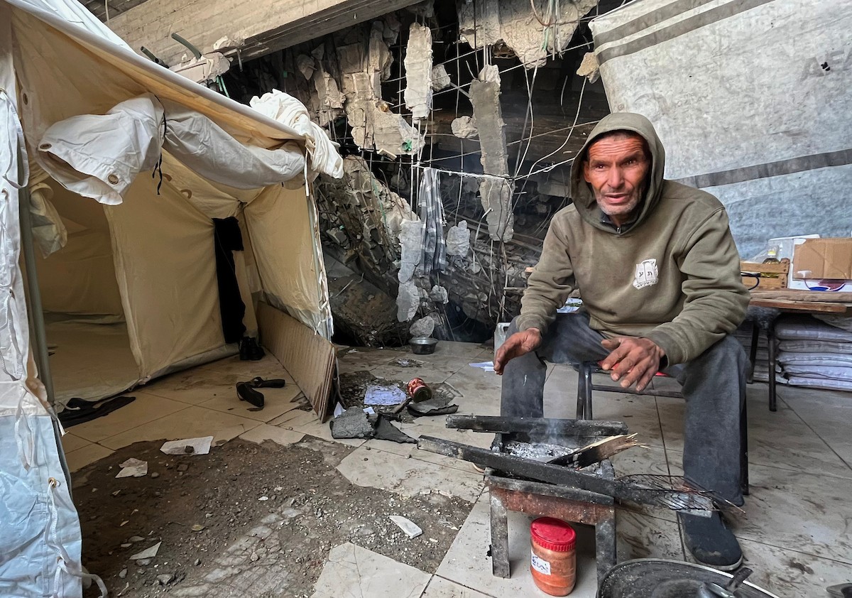يعيش الزوجان الفلسطينيان أشرف وشادية السرساوي مع أحفادهما العشرة داخل خيمة مؤقتة نُصبت في مبنى غير آمن إنشائياً غرب مدينة غزة، وسط تدهور الأوضاع الإنسانية، 18 ديسمبر/كانون الأول 2025.صور: مطر الزاق
