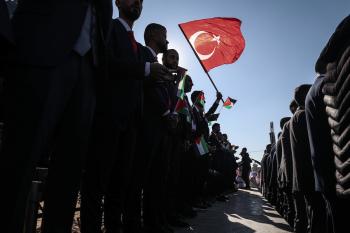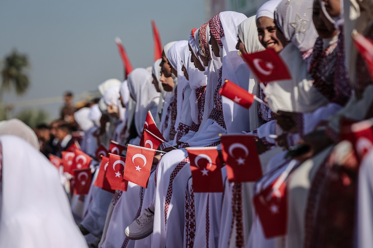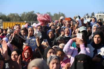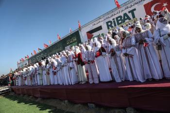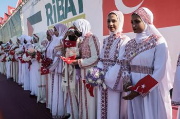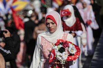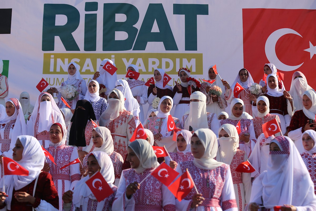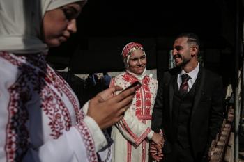 حفل زفاف جماعي لنحو 200 عريس وعروس، تحت عنوان "نحب الحياة رغم الإبادة الجماعية"، نظمته مؤسسة "الرباط" التركية في منطقة الزوايدة، وسط قطاع غزة، 18ديسمبر/كانون الأول 2025. تصوير: عمر أشتوي