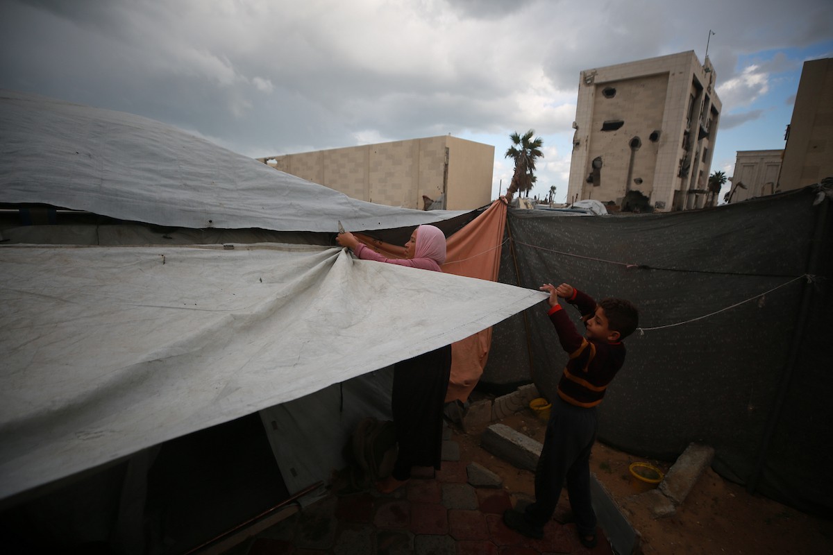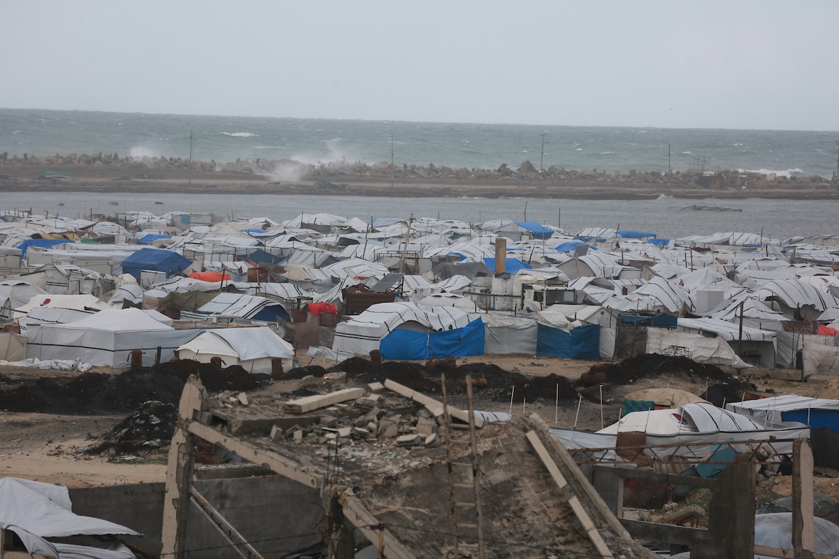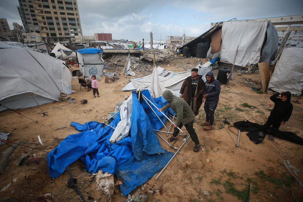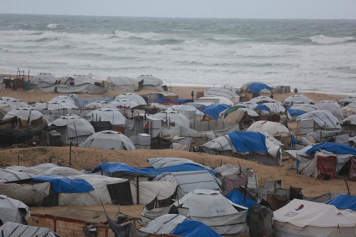 تعيش عائلات فلسطينية نازحة في خيام مهترئة غرب مدينة غزة، حيث تفاقمت معاناتها بعد أن تضررت الخيام وغمرتها مياه الأمطار الغزيرة المصاحبة لعاصفة شتوية ضربت القطاع مدينة غزة، 28 ديسمبر/كانون الأول 2025. تصوير: عمر أشتوي