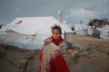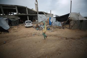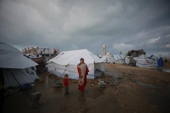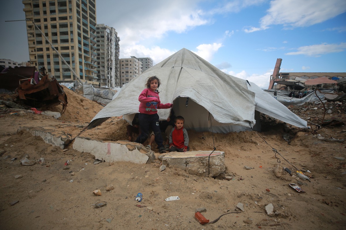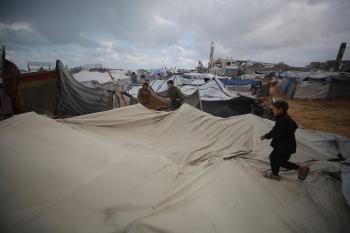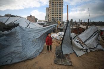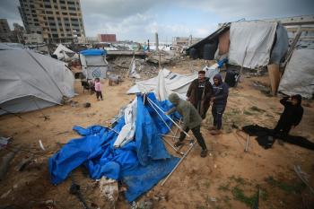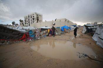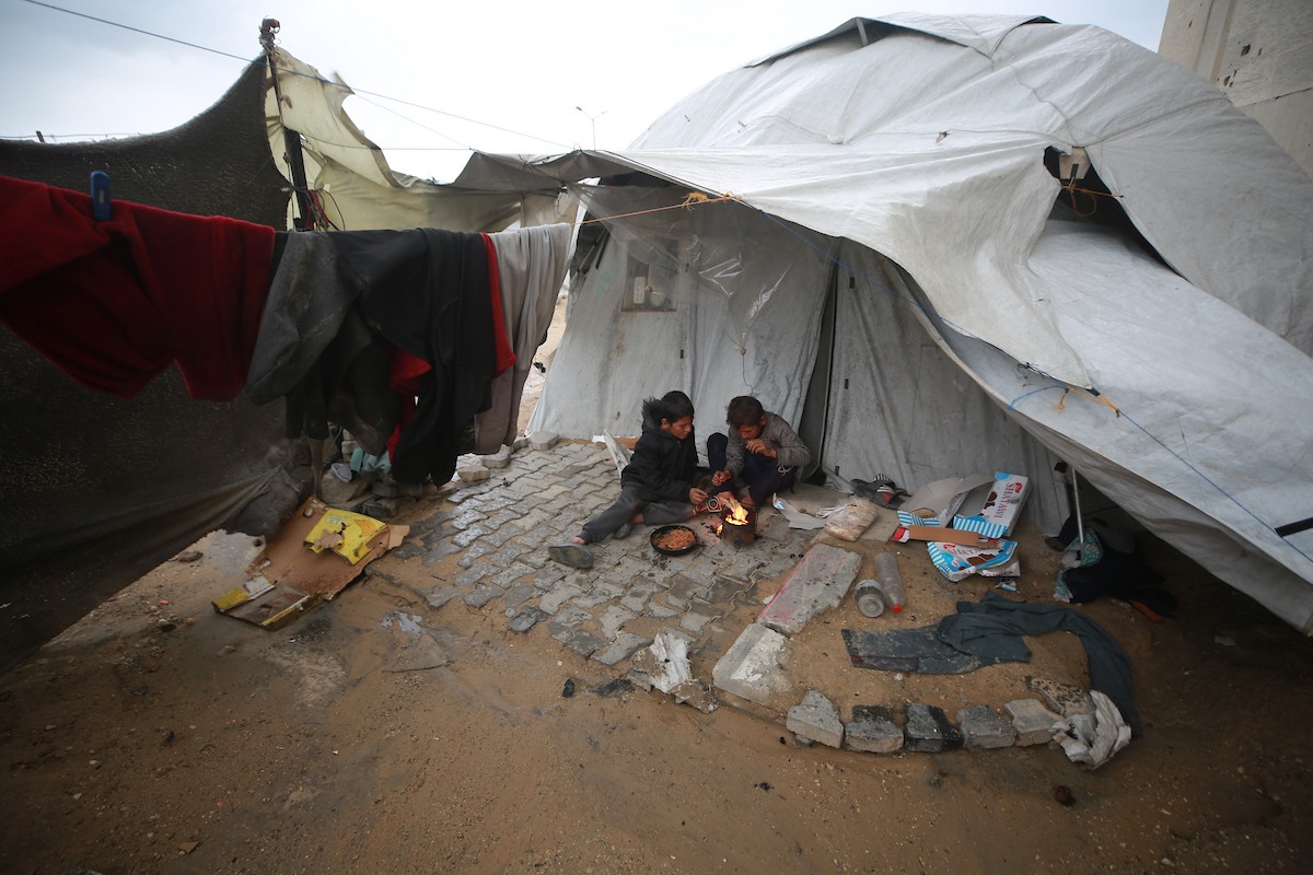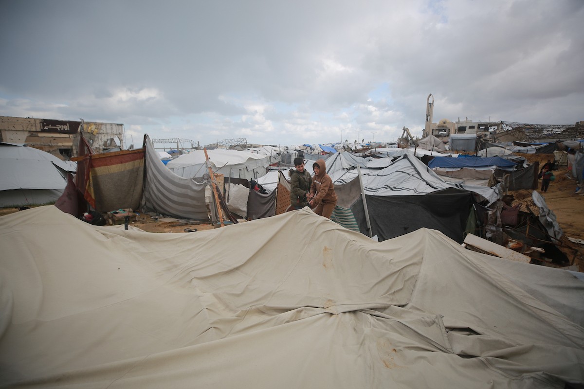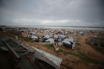 تعيش عائلات فلسطينية نازحة في خيام مهترئة غرب مدينة غزة، حيث تفاقمت معاناتها بعد أن تضررت الخيام وغمرتها مياه الأمطار الغزيرة المصاحبة لعاصفة شتوية ضربت القطاع مدينة غزة، 28 ديسمبر/كانون الأول 2025. تصوير: عمر أشتوي