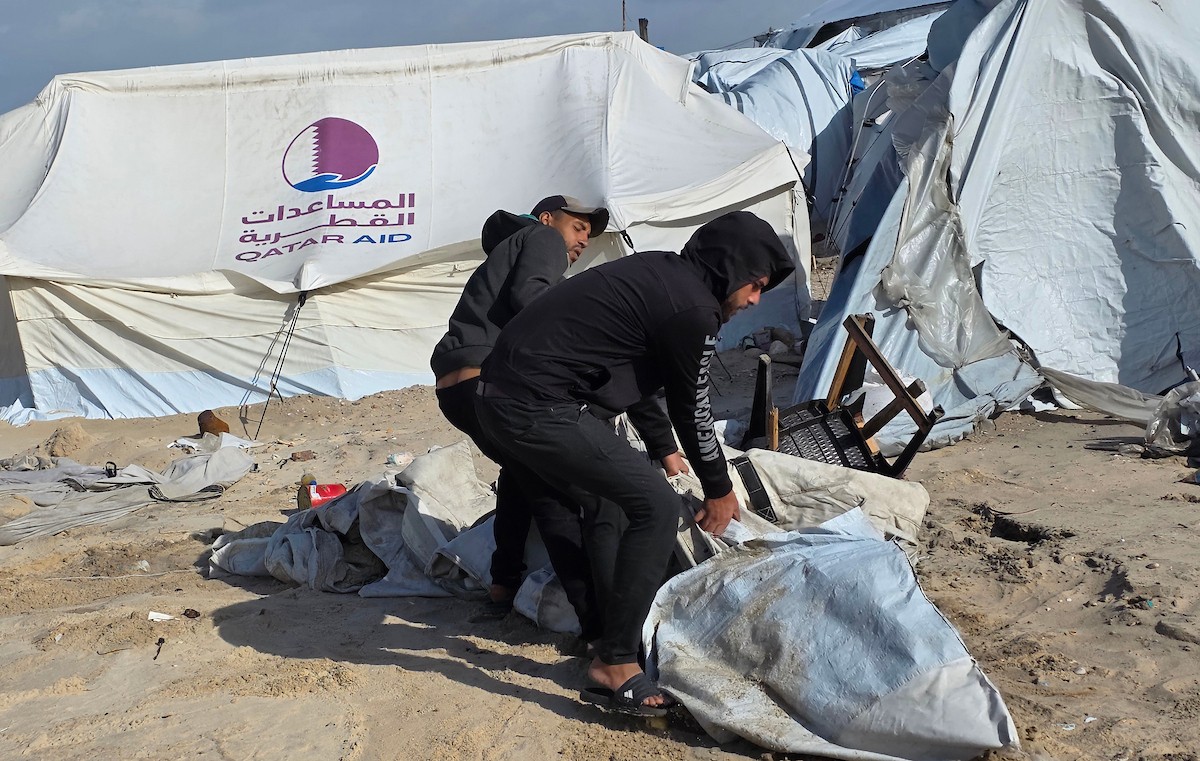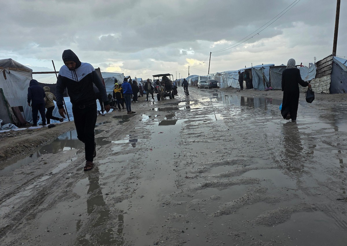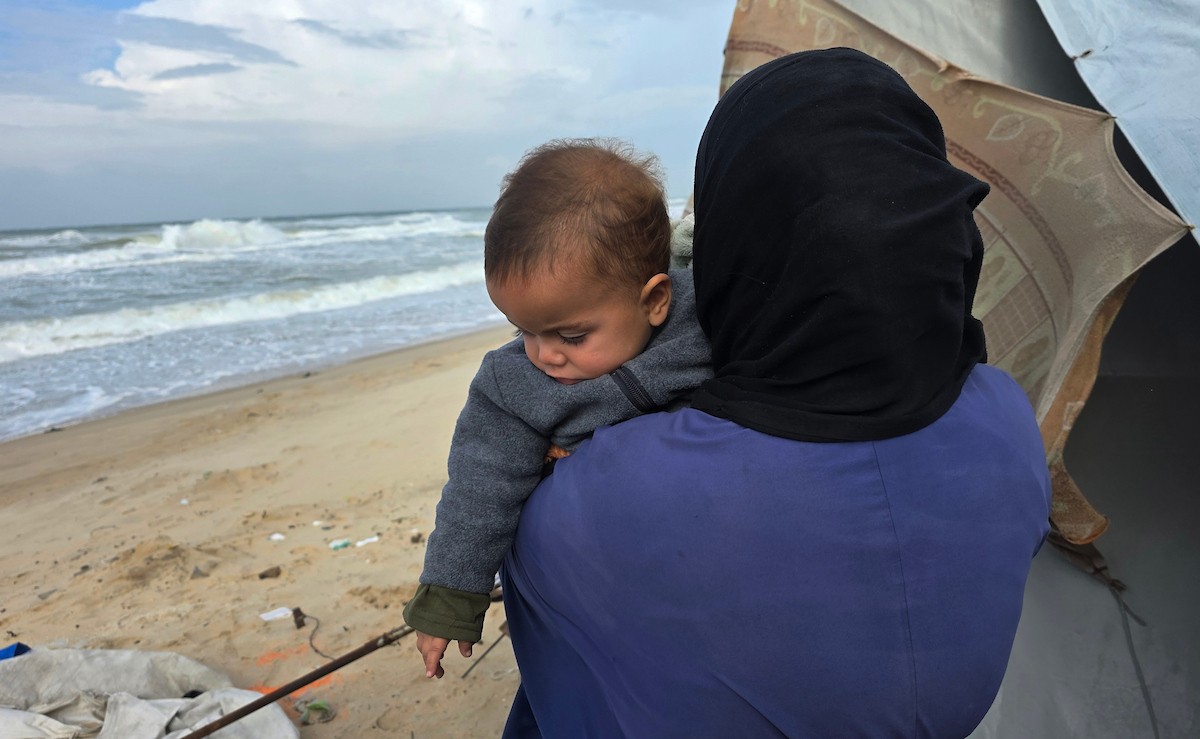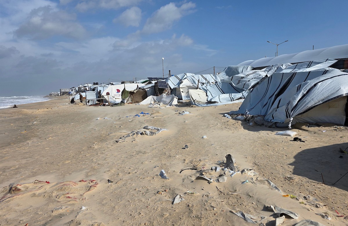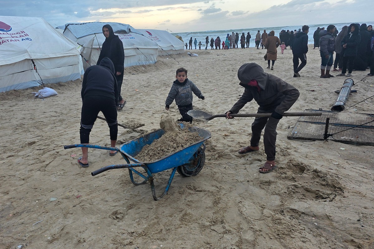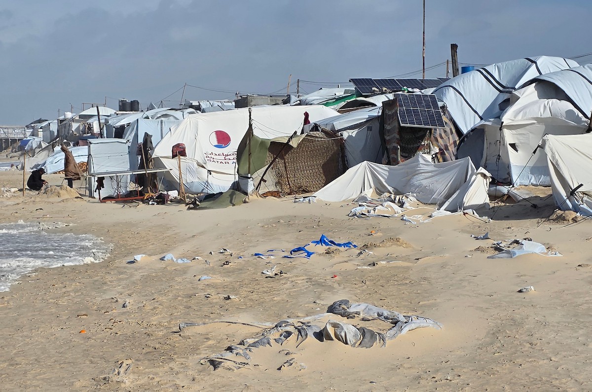 تواجه آلاف العائلات التي تعيش في خيام على شاطئ المواصي في خان يونس، جنوب قطاع غزة، مأساة إنسانية بعد أن جرفت مياه البحر خيامها، تاركةً الأطفال والنساء بلا مأوى.، 29 ديسمبر/كانون الأول 2025.صورة: طارق محمد