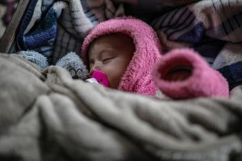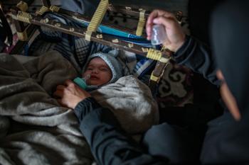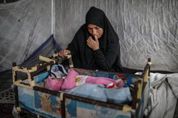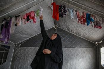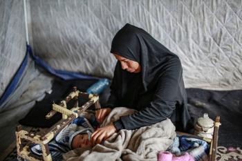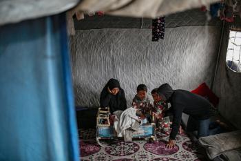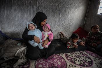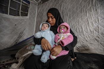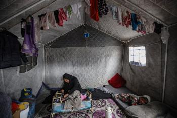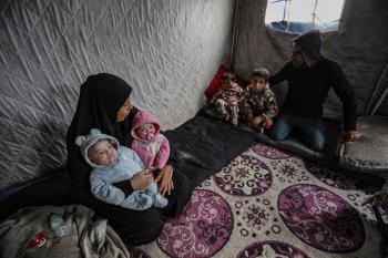 عائلة فلسطينية نازحة مكونة من ستة أفراد تكافح وسط ظروف غير إنسانية من أجل حماية أطفالها من أجواء الشتاء القارس في خيمة مهترئة بملعب اليرموك في مدينة غزة، 29 ديسمبر/كانون الأول 2025 صورة: عمر أشتوي