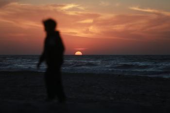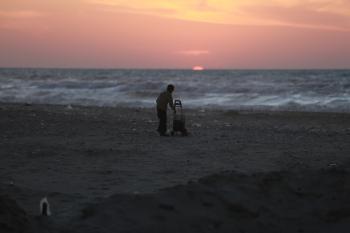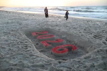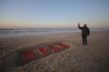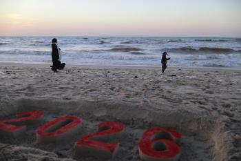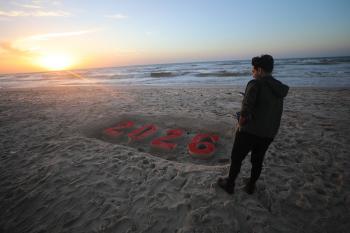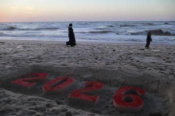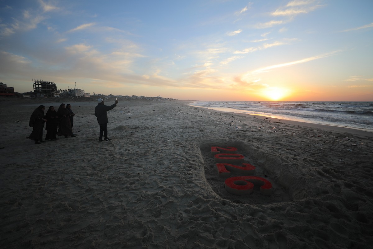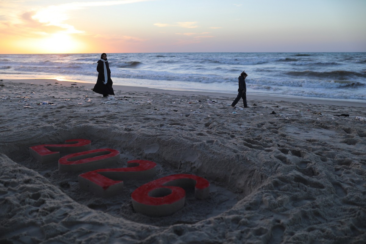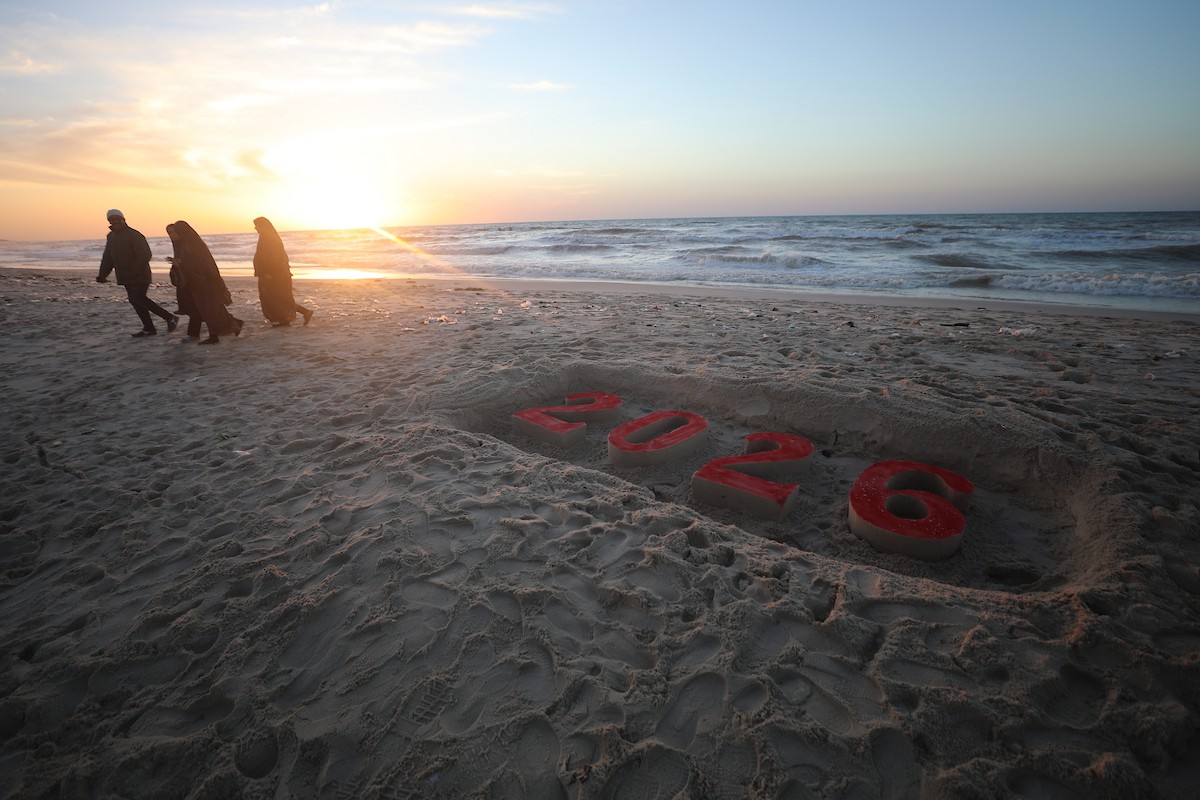 فلسطينيون يودعون عام 2025 بكتابة 2026 على رمال شاطئ غزة، 31 ديسمبركانون الأول 2025. صورة عمر أشتوي