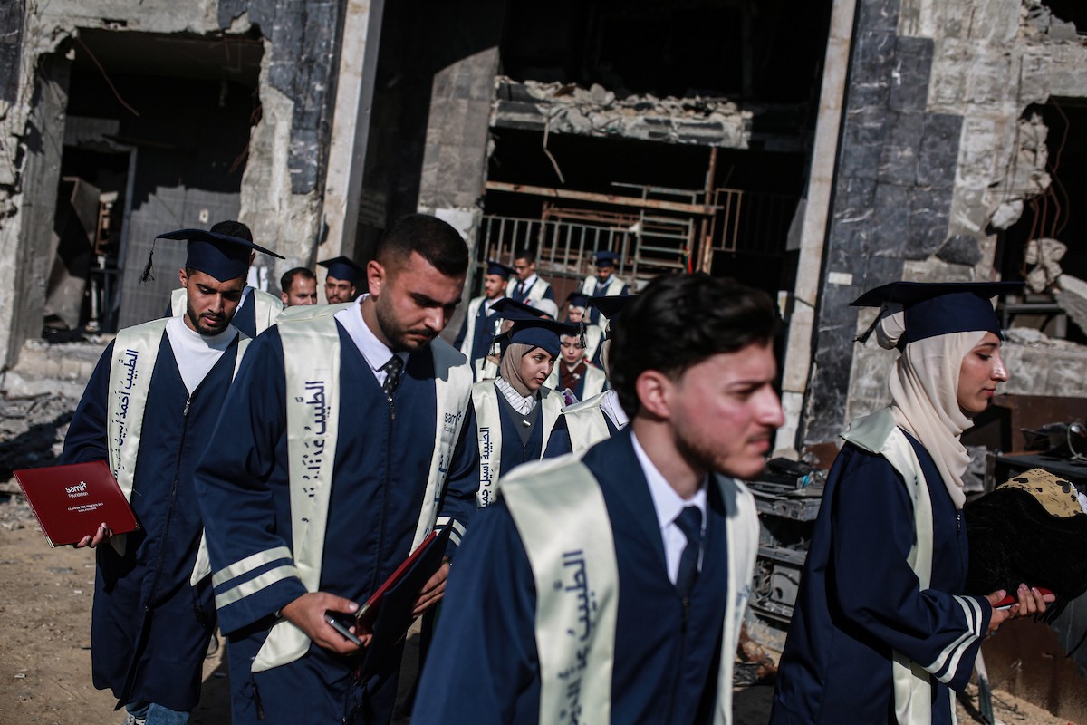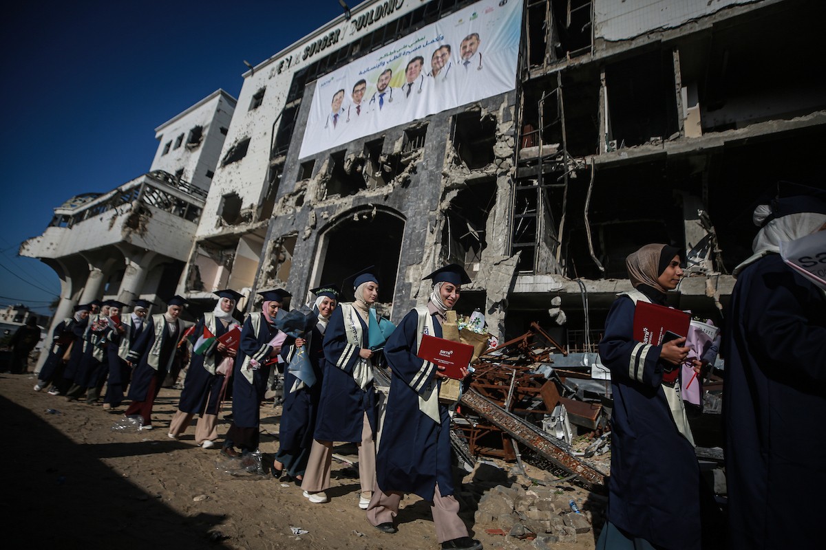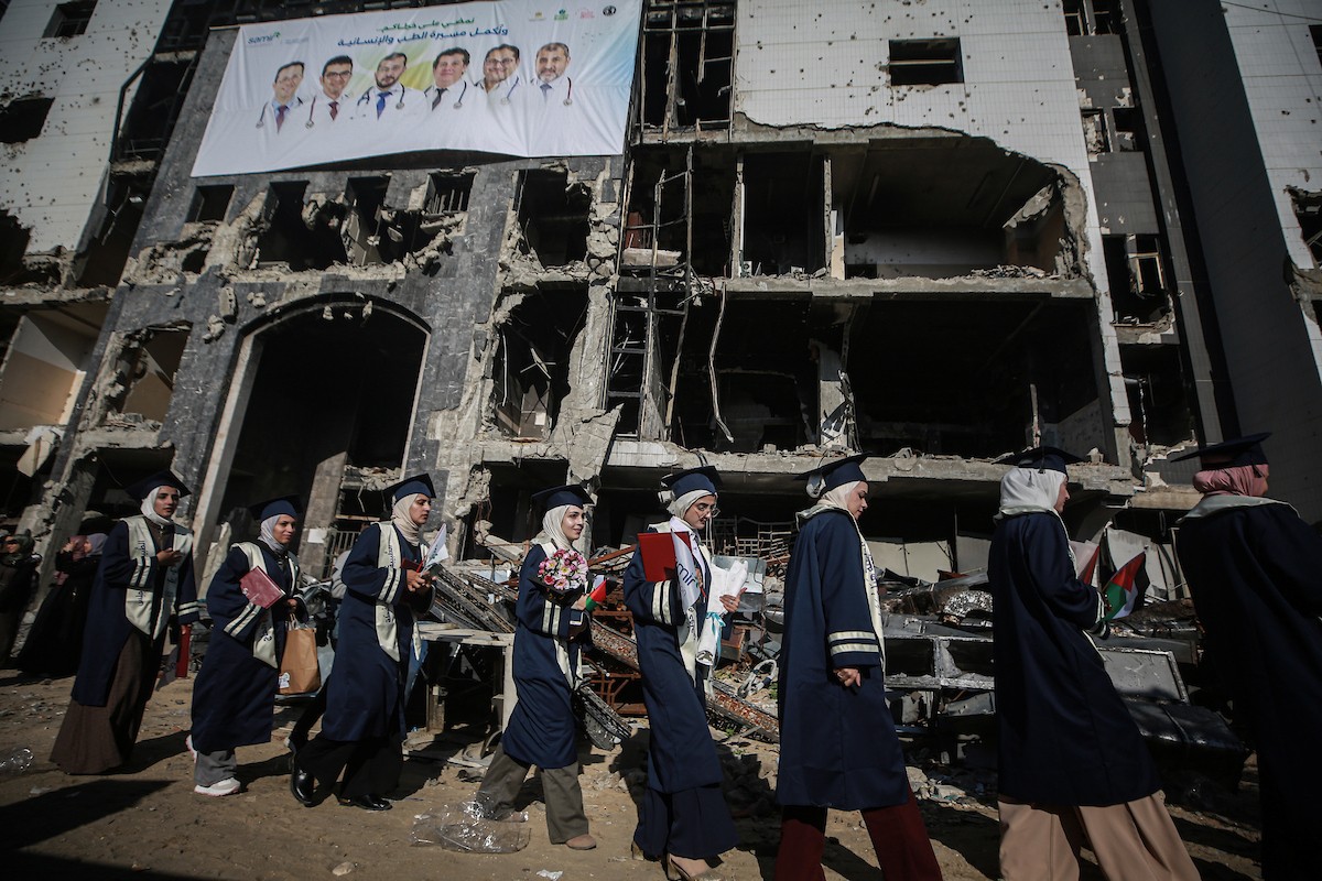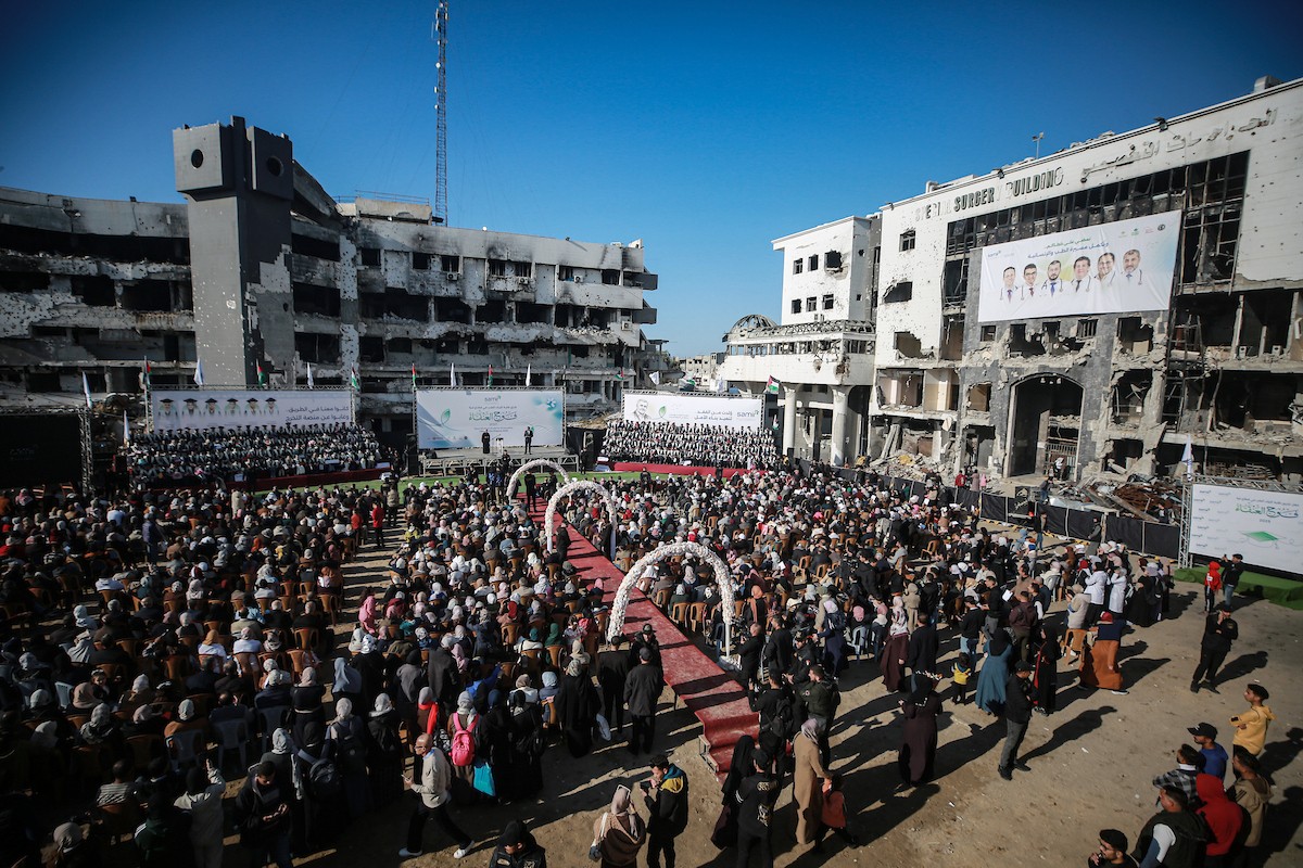 وزارة الصحة حفل تخرج لـ 230 طالبًا وطالبةً في كلية الطب بمجمع الشفاء الطبي (مستشفى الشفاء) الذي تضرر بشدة جراء الهجمات العسكرية الإسرائيلية على مدينة غزة، 3 يناير/كانون الثاني 2026. صورة: عمر أشتوي