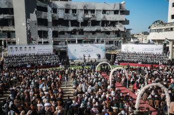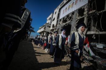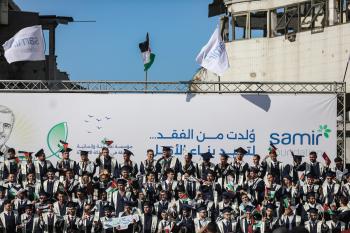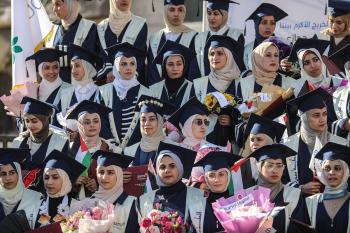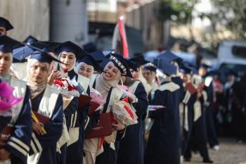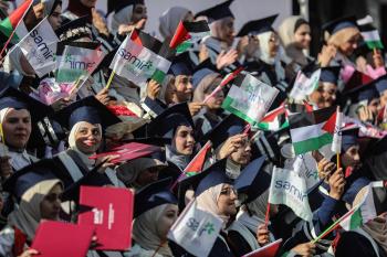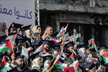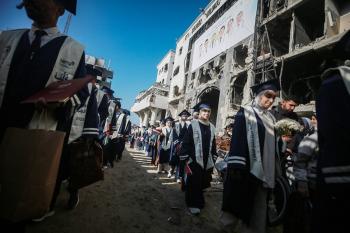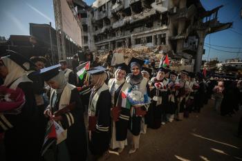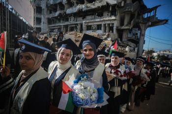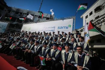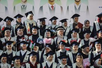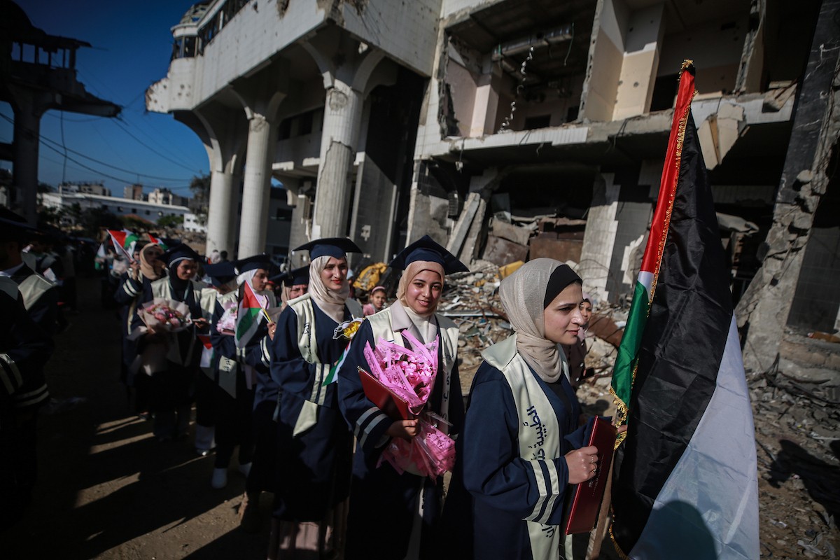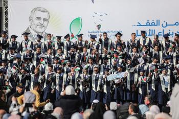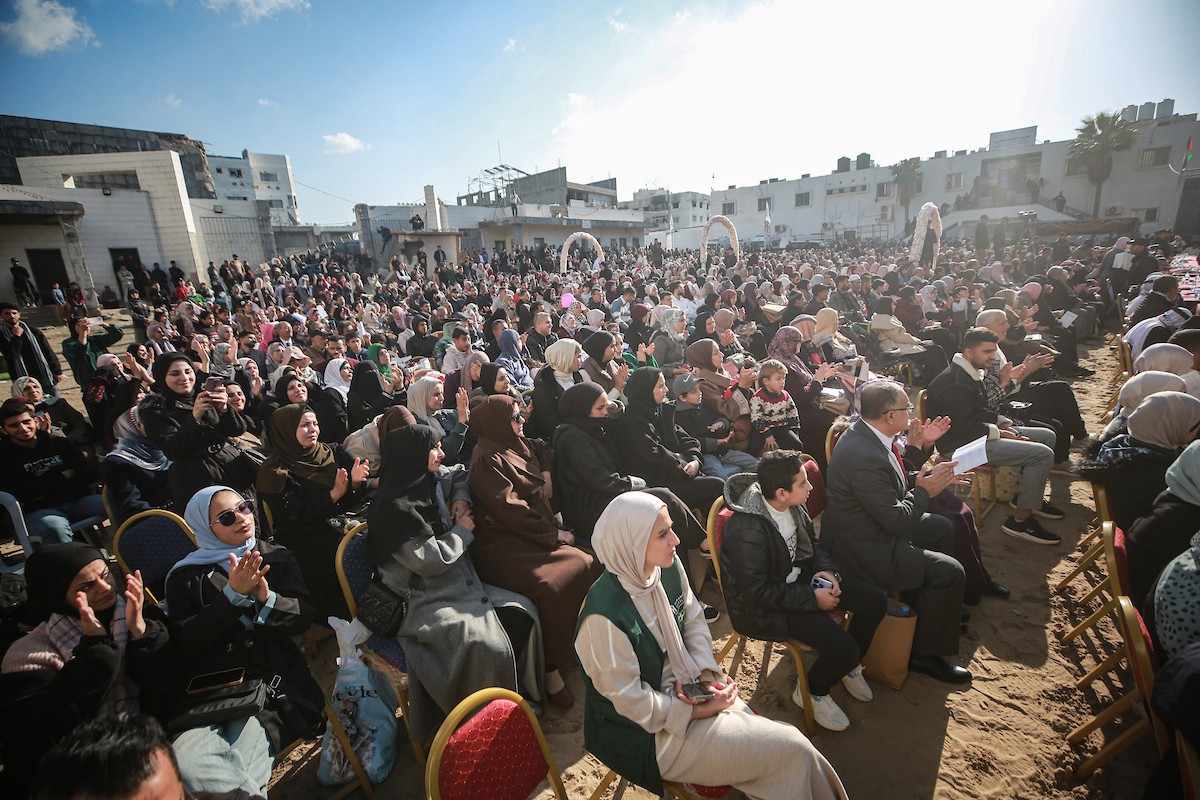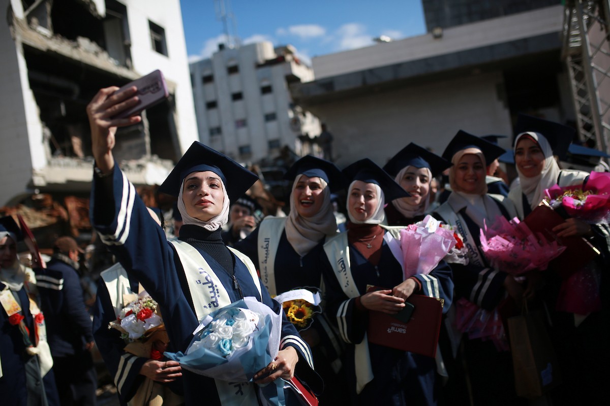 وزارة الصحة حفل تخرج لـ 230 طالبًا وطالبةً في كلية الطب بمجمع الشفاء الطبي (مستشفى الشفاء) الذي تضرر بشدة جراء الهجمات العسكرية الإسرائيلية على مدينة غزة، 3 يناير/كانون الثاني 2026. صورة: عمر أشتوي
