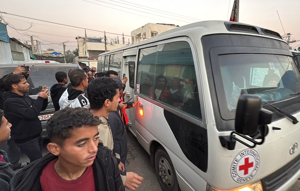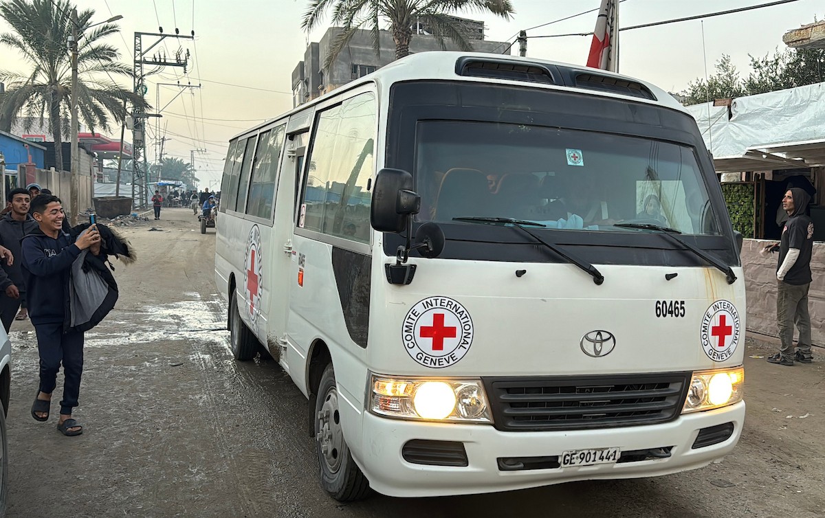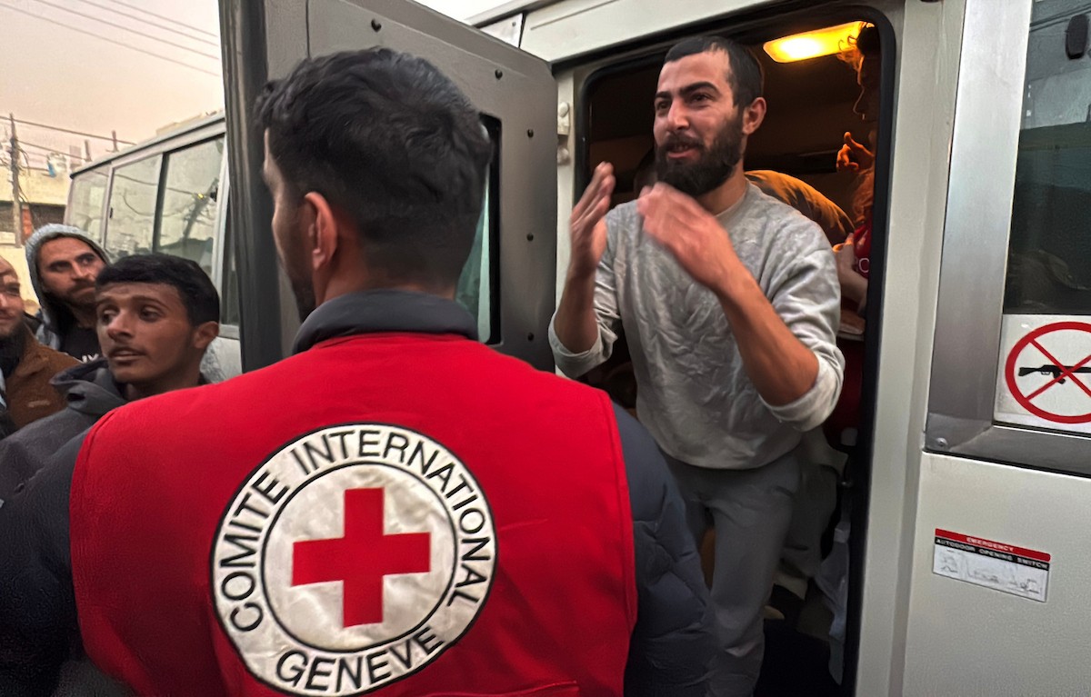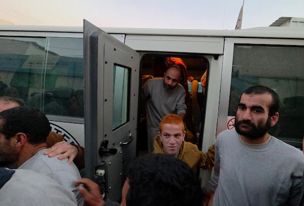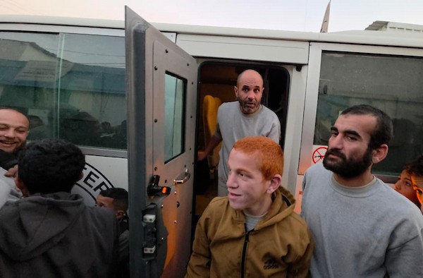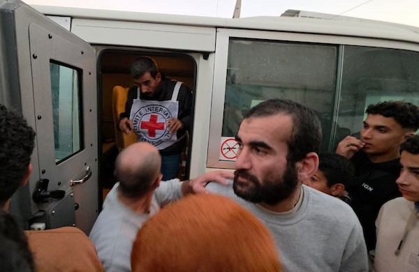 7 يناير/كانون الثاني 2026، نُقل أسرى فلسطينيون أفرج عنهم الجيش الإسرائيلي بواسطة مركبات تابعة للصليب الأحمر إلى مستشفى شهداء الأقصى لإجراء فحوصات طبية في دير البلح، وسط قطاع غزة. (صورة: أحمد إبراهيم)