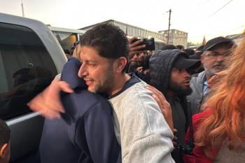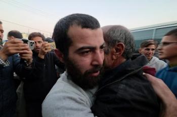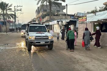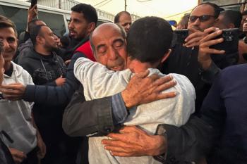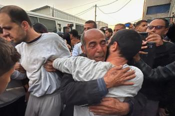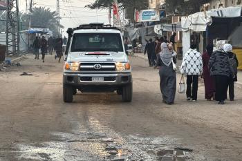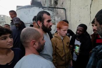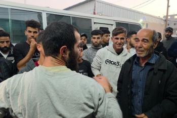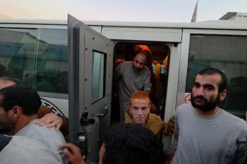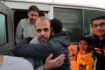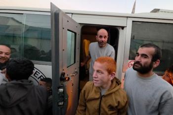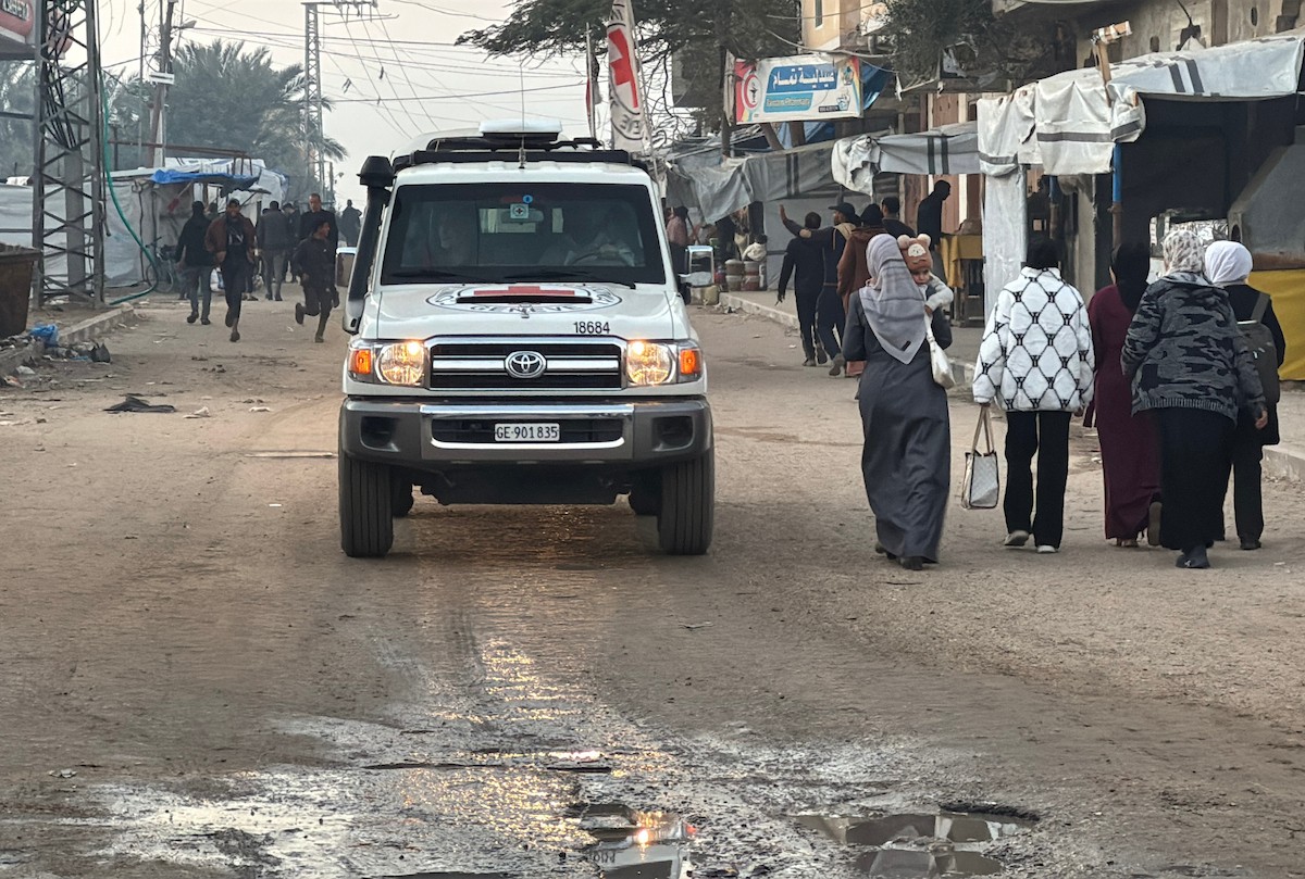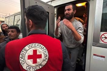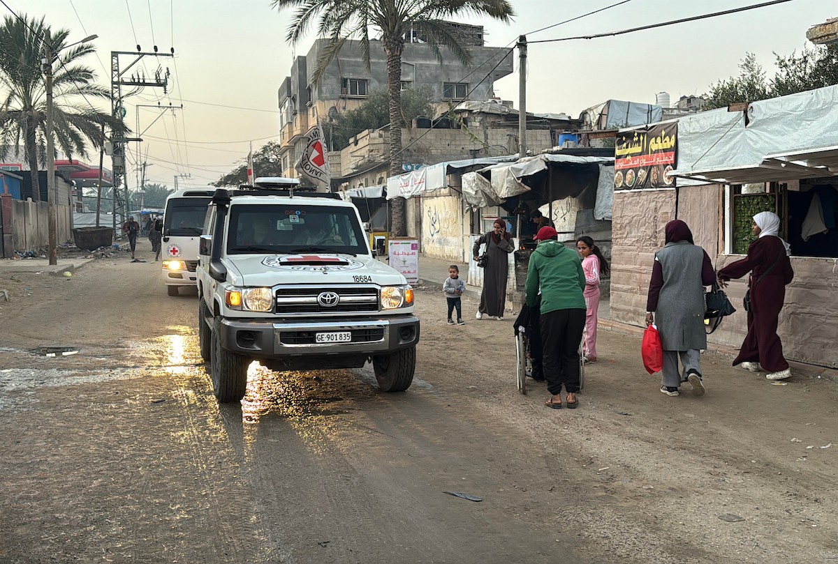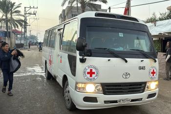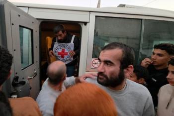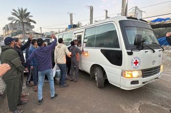 7 يناير/كانون الثاني 2026، نُقل أسرى فلسطينيون أفرج عنهم الجيش الإسرائيلي بواسطة مركبات تابعة للصليب الأحمر إلى مستشفى شهداء الأقصى لإجراء فحوصات طبية في دير البلح، وسط قطاع غزة. (صورة: أحمد إبراهيم)